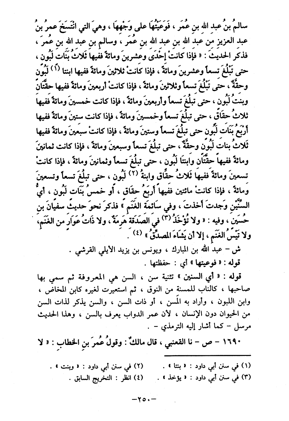 سالمُ بنُ عبدِ الله بنِ عُمَر، فَوَعَيْتُهَا على وَجْهِهَا، وهيَ التي انْتَسَخَ عمرُ بنُ عبد العزيزِ مِن عَبد الله بنِ عبدِ اللهِ بنِ عُمَر، وسالم بنِ عبد الله بنِ عُمرَ، فذكَر الحديثَ: " فَإذا كَانتْ إِحْدَى وعشرينَ ومائةً ففيها ثَلاثُ بنات لَبُون، حتى تَبْلُغَ تسعا وعشرينَ ومائة، فإذا كَانتْ ثلاثينَ ومائة ففيها ابنتا (1) لَبُون وحِقَّة، حتى تَبْلُغَ تسعا وثلاثينَ ومائةً، فإذا كانتْ أربعينَ ومائةً ففيها حقتانِ وبنتُ لَبُون، حتى تَبلُغَ تسعا وأربعينَ ومائةً، فإذا كانت خمسينَ ومائةً فَفيها ثلاثُ حِقَاق، حتى تبلُغَ تسعا وخمسينَ ومائةً، فإذا كانت سِتينَ ومائةً ففيها أرْبَعُ بناتِ لبون حتى تبلُغَ تسعا وستينَ ومائةً، فإذا كانتْ سبعينَ ومائةً ففيها ثَلاثُ بنات لَبُوًن وحقة، حتى تبلُغَ تسعا وسبعينَ ومائةً، فإذا كانت ثمانينَ ومائةً ففيها حقتاَنِ وَابنتَا لَبُون، حتى تبلُغَ تسعا وثمانينَ ومائةً، فإذا كانتْ تسعينَ ومائةًَ ففيها ثَلاثُ حقَاق وابنةُ (2) لَبُون، حتى تبلُغَ تسعا وتسعينَ ومائةً، فإذا كانتْ مائتين ففَيهاً أربَعُ حقَاق، أو خمسُ بناتٍ لَبُون، أيُ السنيْنِ وَجدتَ أخذتَ، وفي سَائمَة الغًنَم " فذكرَ نحوَ حديث سفيان بنِ حُسَين، وفيه:" ولا تُؤْخَذُ (3) في الصًدَقةِ هَرِمَة، ولا ذات عَوَارٍ من الغَنَم، ولا تيس الغَنَم، إلا أن يَشَأ المصدَّقُ " (4) .