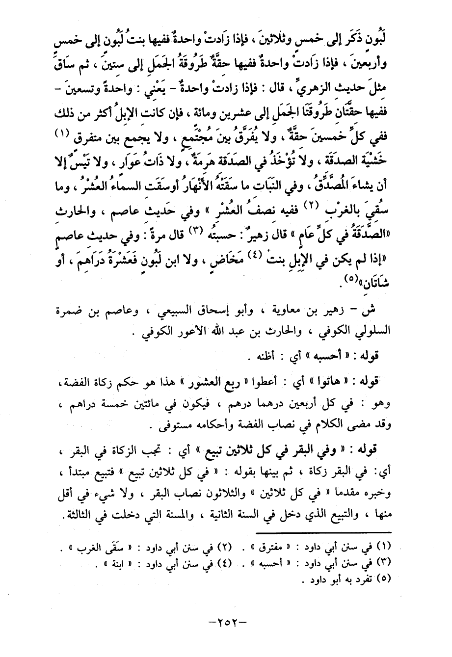 لَبُونٍ ذَكَر إلى خمسة وثلاثينَ، فإذا زَادتْ واحدةٌ ففيها بنتُ لَبُونٍ إلى خمسٍ وأربعينَ، فإذا زَادتْ واحدةٌ ففيها حقة طَرُوقَةُ الجَمَلِ إلى ستينَ، ثم سَاقَ مِثلَ حديثِ الزهريِّ، قال: فإذا زادت واحدة- يَعْنِي: واحَدةً وتسعينَ- ففيها حقتانِ طَرُوقَتَا الجَمَلِ إلى عشرين ومائةٍ، فإن كانتا الإبِلُ كثر من ذلك ففي كل خمسينَ حقة، ولا يُفَرَّقُ بينَ مُجْتَمِعٍ، ولا يجمع بين متفرقٍ (1) خَشْيَة الصدَقَة، ولا تُؤْخَذُ في الصَدَقة هَرمَة، ولا ذَاتُ عَوَارٍ، ولا تَيْس إلا أن يشأ المُصدقُ، وفي النَبَاتِ ما سقتْهُ الأَنْهَارُ أو سقتِ السماء العُشْرُ، وما سقيَ بالغرْب (2) ففيه نصفُ العُشْرِ" وفي حَديثِ عاصم، والحارثِ "الصَدَقَةُ في كَل عَامٍ " قالَ زهير: حسبتُه (3) قال مرةً: وفي حديثِ عاصمٍ "إذا لم يكن في الإِبِلِ بنت (4) مَخَاضٍ، ولا ابن لَبُونٍ فَعَشْرَةُ درَاهِمَ، أو شَاتَانِ " (5) .