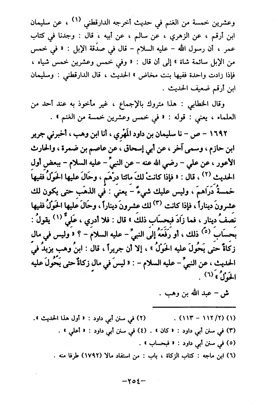 1692- ص- نا سليمان بن داود المَهْرِي، أنا ابن وهب، أخبرني جابر ابن حازم، وسمى آخر، عن أبي إسحاق، عن عام م بن ضمرة، والحارث الأعور، عن علي- رضي الله عنه- عن النبي- عليه السلامَ ببعضِ أول الحديث (2) ، قال: "فإذا كانتْ لكَ مِائتا درْهَمٍ، وحالَ عليها الحَوْلُ ففيهاَ خمسةُ درَاهمَ، وليس عليك شيء- يعني: في الذهَب حتى يكون لك عِشرونَ ديناراً فإذا كانت (3) لك عشرونَ ديناراً وحالَ عَليها الحَولُ ففيها نصفُ دِينار، فما زَادَ فبحِسَاب ذلكَ " قال: فلا أدرِي، علي (1) يقولُ: بَحسَابِ (5) ذلك، أو رفعَهُ إلى النبي- عليه السلام-؟ "وليس في مالٍ زكَاة حتى يَحُولَ عليه الحَوْلُ"، إلا أن جريراً، قال: ابنُ وهب يزيدُ في الحديث، عن النبي- عليه السلام-: "ليسَ في مال زكاة حتى يَحُولَ علبه الحَوْلُ " (6) .