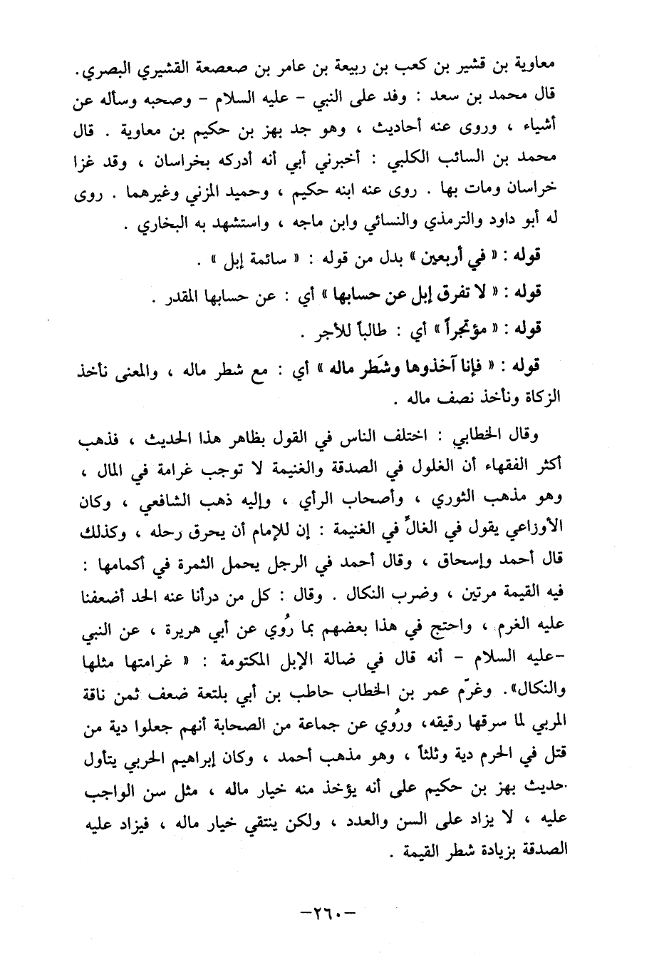 وقال الخطابي: اختلف الناس في القول بظاهر هذا الحديث، فذهب كثر الفقهاء أن الحلول في الصدقة والغنيمة لا توجب غرامة في المال، وهو مذهب الثوري، وأصحاب الرأي، وإليه ذهب الشافعي، وكان الأوزاعي يقول في الغالَّ في الغنيمة: إن للإمام أن يحرق رحله، وكذلك قال أحمد وإسحاق، وقال أحمد في الرجل يحمل الثمرة في أكمامها: فيه القيمة مرتين، وضرب النكال. وقال: كل من درأنا عنه الحد أضعفنا عليه الغرم، واحتج في هذا بعضهم بما رُوي عن أبي هريرة، عن النبي - عليه السلام- أنه قال في ضالة الإبل المكتومة:" غرامتها مثلها والنكال". وغرّم عمر بن الخطاب حاطب بن أبي بلتعة ضعف ثمن ناقة المربي لما سرقها رقيقه، ورُوي عن جماعة من الصحابة أنهم جعلوا دية من قتل في الحرم دية وثلثاً وهو مذهب أحمد، وكان إبراهيم الحربي يتأول، حديث بهز بن حكيم على أنه يؤخذ منه خيار ماله، مثل سن الواجب عليه، لا يزاد على السن والعدد، ولكن ينتقي خيار ماله، فيزاد عليه الصدقة بزيادة شطر القيمة.