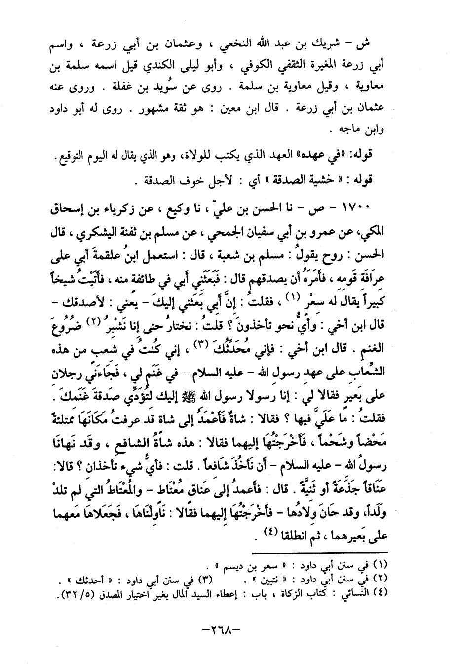 1700- ص- نا الحسن بن عليّ، نا وكيع، عن زكرياء بن إسحاق المكي، عن عمرو بن أبي سفيان الجمحي، عن مسلم بن ثفنة اليشكري، قال الحسن: روح يقولُ: مسلم بن شعبة، قال: استعمل ابنُ علقمةَ أبي على عِرَافَة قَومه، فأمَرَهُ أن يصدقهم قال: فَبَعَثَنِي أبي في طائفةِ منه، فأتَيْتُ شيخا كبيرا يقال له سِعْر (1) ، فقلتُ: إن أبِي بَعَثني إليكَ- يعني: لأصدقك- قال ابن أخي: وأيُ نحو تأخذون؟ قلتُ: نختارُ حتى إِنا نَشْبِر (2) ضُرُوعَ الغنم. قال ابن أخي: فإني مُحَدثك (3) ، إني كُنتُ في شعبِ من هذه الشعابِ على عهد رسول الله- عليه السلام- في غَنَم لي، فَجاءني رجلانِ على بَعيرِ فقالا ليَ: إنا رَسولا رسول الله صلى الله عليه وسلم إليك لتؤَدِّي صَدقةَ غَنَمكَ. فقلتُ: ما عَلَيَّ فيها؟ فقالا: شاةٌ فَأعْمَد إلى شاة قَد عرفتُ مَكَانَهَا مَمتلئةَ مَحْضا وشَحْما، فَأخْرَجْتُهَا إليهما فقالا: هذه شاَةُ الشافع، وقَد نَهانَا رسولُ اللهِ- عليه السلام- أن نأخذ شَافعا. قلت: فأيُ شيء تأخذانِ؟ قالا: عَنَاقا جَذَعَةَ أو ثَنيَّةَ. قال: فأعمدُ إلى عَناق مُعْتَاط- والمُعْتَاطُ التي لم تلدْ وَلَداَ، وقد حانَ وِلادها- فأخْرَجْتُهَا إليهما فقَالا: نَاَوِلنَاهَا، فَجَعَلاهَا مَعهما على بَعيرهما، ثم انطلقا (4) .