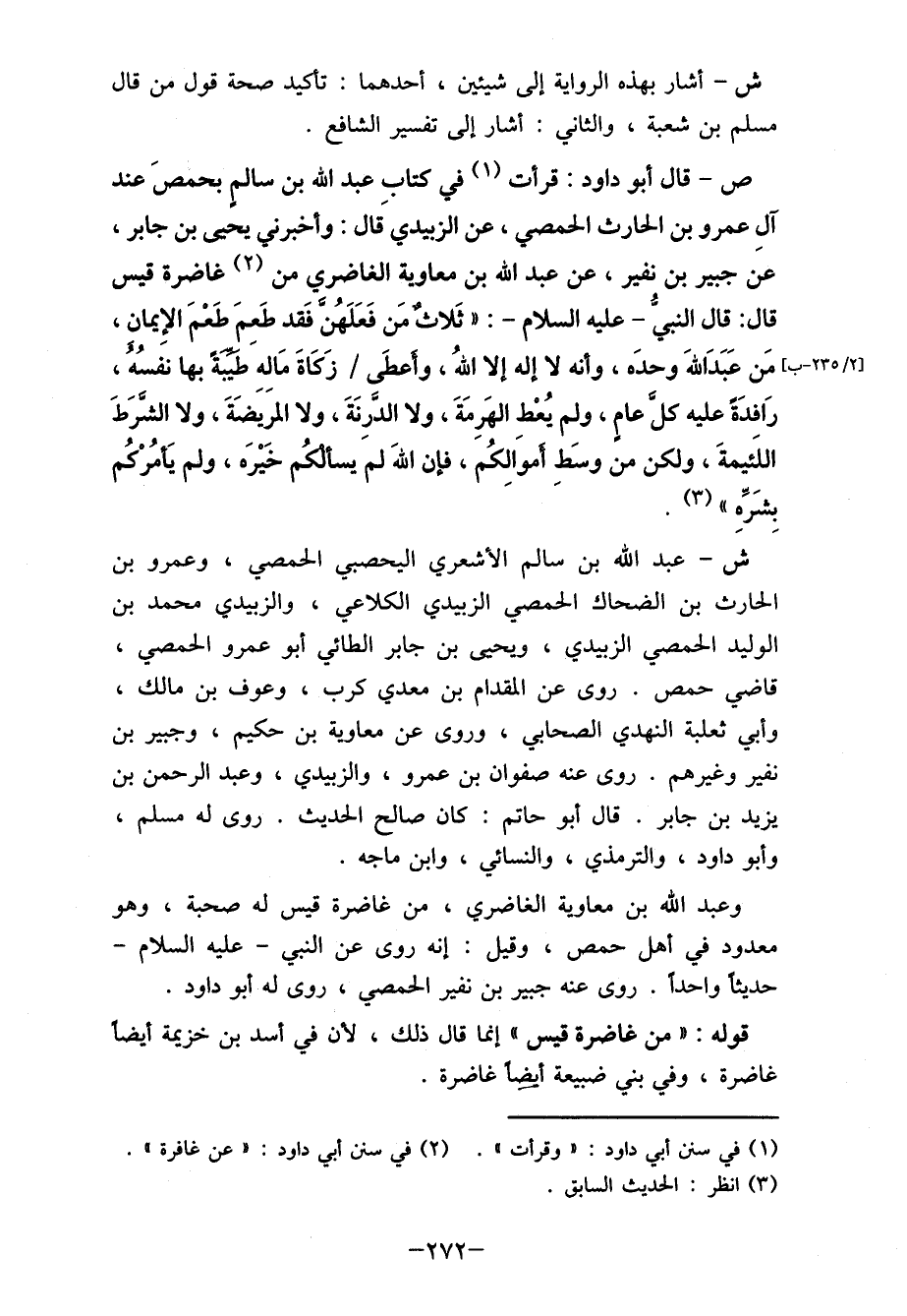 ص- قال أبو داود: قرأت (1) في كتاب عبد الله بن سالمٍ بحمصَ عند اَلِ عمرو بن الحارث الحمصي، عن الزبيدي قَال: وأخبرني يحيى بن جابر، عن جبير بن نفير، عن عبد الله بن معاوية الغاضري من (2) حاضرة قيس قال: قال النبي- عليه السلام-: "ثَلاث مَن فَعَلَهُن فَقد طَعمَ طَعْمَ الإِيمان، مَن عَبَدَ اللهَ وحدَه، وأنه لا إله إلا اللهُ، وأعطَى/ زَكَاةَ مَالهَِ طيبةً بها نفسُه، رَافدةً عليه كل عامٍ، ولم يُعْط الهَرِمَةَ، ولا الدرِنَةَ، ولا المرَيضَةَ، ولا الشرَطَ اللَئيمةَ، ولكن من وسَطِ أموَالِكُم، فإن اللهَ لم يسألكم خَيْرَه، ولم يأمُرْكُم بِشَرِّهِ" (3) .