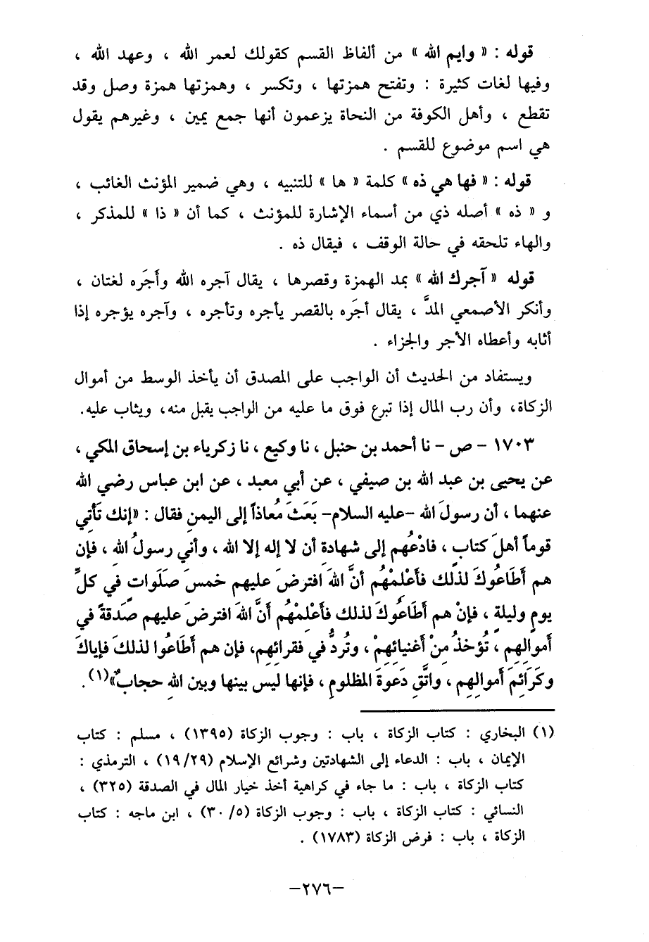 1703- ص- نا أحمد بن حنبل، نا وكيع، نا زكرياء بن إسحاق المكي، عن يحيى بن عبد الله بن صيفي، عن أبي معبد، عن ابن عباس رضي الله عنهما، أن رسولَ الله- عليه السلام- بَعَثَ مُعاذا إلى اليمنِ فقال: "إنك تَأتِي قوما أهلَ كتاب، فادْعُهم إلى شهادة أن لا إله إلا الله، وأني رسولُ اللهِ، فإن هم أطَاعُوكَ لذلك فأعْلمهُم أنَّ الله افترضَ عليهم خمسَ صَلَوات في كلّ يومٍ وليلة، فإنْ هم أطَاعوكَ لذلك فأعْلِمْهُم أن اللهَ افترضَ عليهم صَدقة في أموالِهِم، تُؤخذُ مِنْ أغنيائِهِمْ، وتُردُ في فقرائِهِم، فإن هم أطَاعُوا لذلكَ فإياكَ وكَرَائِمَ أموالِهِم، واتَقِ دَعوةَ المظلوم، فإنها ليس بينها وبن اللهِ حجاب" (1) .