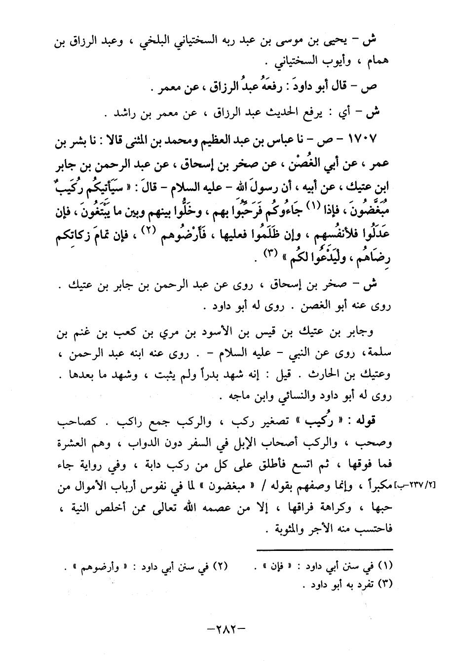 1707- ص- نا عباس بن عبد العظيم ومحمد بن المثنى قالا: نا بشر بن عمر، عن أبي الغُصْن، عن صخر بن إسحاق، عن عبد الرحمن بن جابر ابن عتيق، عن أبيه، أن رسولَ الله- عليه السلام- قالَ: " سَيأتِيكُم رُكَيبٌ مُبَغضُونَ، فإذا (1) جاءوكُم فَرَحبوَا بهم، وخَلوا بينهم وبن ما يَبْتَغُونَ، فإن عَدلوا فلأنفُسهم، وإن ظَلَمُوا فعليها، فَأرْضُوهم (2) ، فإن تمامَ زكاتكم رِضَاهُم، وليَدعوا لكُم" (3) .