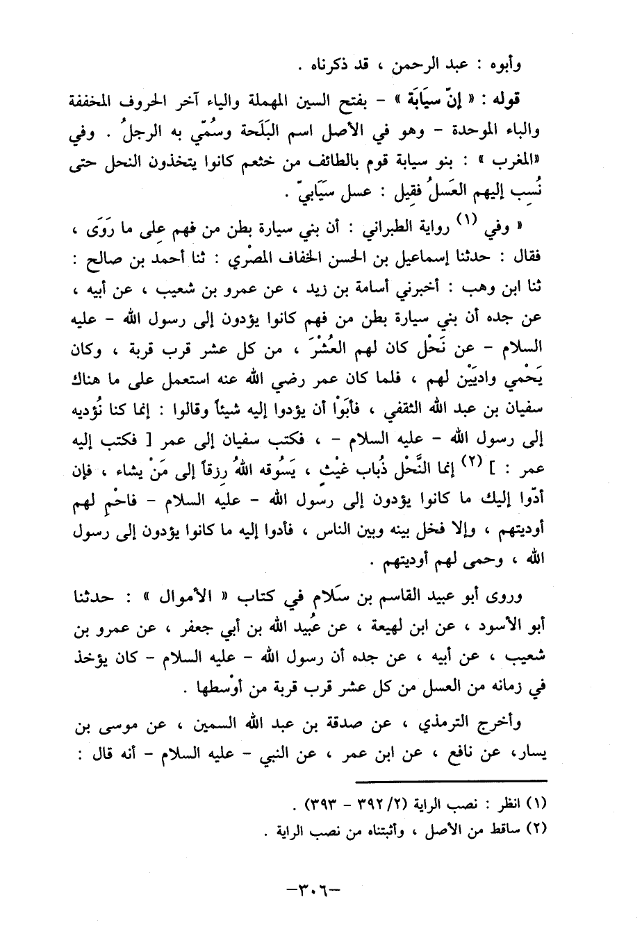 " وفي (1) رواية الطبراني: ابن بني سيارة بطن من فهم على ما رَوَى، فقال: حدثنا إسماعيل بن الحسن الخفاف المصْري: أنا أحمد بن صالح: أنا ابن وهب: أخبرني أسامة بن زيد، عن عمرو بن شعيب، عن أبيه، عن جده أن بني سيارة بطن من فهم كانوا يؤدون إلى رسول الله- عليه السلام- عن نَحْل كان لهم العُشْرَ، من كل عشر قرب قربة، وكان يَحْمي واديَيْن لهم، فلما كان عمر رضي الله عنه استعمل على ما هناك سفيان بن عبد الله الثقفي، فأبَوْا أن يؤدوا إليه شيئا وقالوا: إنما كنا نُؤديه إلى رسول الله- عليه السلام-، فكتب سفيان إلى عمر [فكتب إليه عمر:] (2) إنما النَّحْل ذُباب غيْثِ، يَسُوقه اللهُ رِزقا إلى مَنْ يشاء، فإن أدوا إليك ما كانوا يؤدون إلى رسول الله- عليه السلام- فاحْم لهم أوديتهم، وإلا فخل بينه وبن الناس، فأدوا إليه ما كانوا يؤدون إلى رسول الله، وحمى لهم أوديتهم.