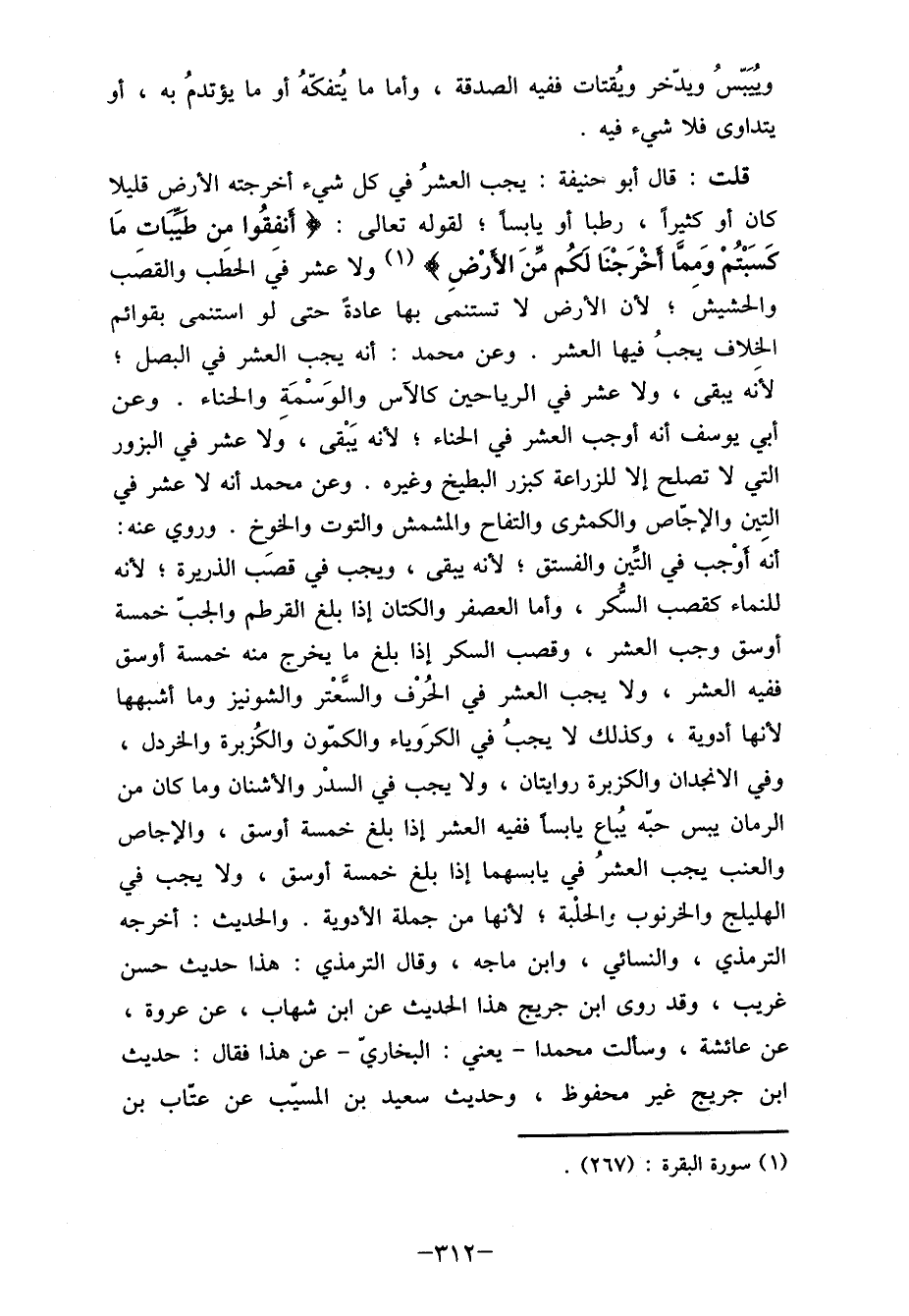 قلت: قال أبو حنيفة: يجب العشرُ في كل شيء أخرجته الأرض قليلا كان أو كثيراً، رطبا أو نابساً لقوله تعالى: {أنفقُوا من طيبَات مَا كَسَبْتُمْ وَمما أخْرَجْنَا لَكُم مِّنَ الأرْضِ} (1) ولا عشر فيه الحطَب والقصَب والحشيشَ؛ لأن الأرض لا تستنمى بها عادةً حتى لو استنمى بقوائم الخلاف يجبُ فيها العشر. وعن محمد: أنه يجب العشر في البصل؛ لائق يبقى، ولا عشر في الرياحين كالآس والوَسْمَة والحناء. وعن أبي يوسف أنه أوجب العشر في الحناء؛ لأته يَبْقى، وَلا عشر في البزور التي لا تصلح إلا للزراعة كبزر البطيخ وغيره. وعن محمد أنه لا عشر في التين والإجاص والكمثرى والتفاح والمشمش والتوت والخوخ. وروي عنه: أنه أوْجب في التين والفستق؛ لأنه يبقى، ويجب في قصَب الذريرة؛ لأنه للنماء كقصب السُكر، وأما العصفر والكتان إذا بلغ القرطم والجب خمسة أوسق وجب العشر، وقصب السكر إذا بلغ ما يخرج منه خمسة أوسق ففيه العشر، ولا يجب العشر في الحُرْف والسَعْتر والشونيز وما أشبهها لأنها أدوية، وكذلك لا يجبُ في الكرَوياء والكمون والكُزبرة والخردل، وفي الانجدان والكزبرة روايتان، ولا يجب في السدْر والأشنان وما كان من الرمان يبس حبّه يُباع يابسا ففيه العشر إذا بلغ خمسة أوسق، والإجاص والعنب يجب العشرُ في يابسهما إذا بلغ خمسة أوسق، ولا يجب في الهليلج والخرنوب والحلْبة؛ لأنها من جملة الأدوية. والحديث: أخرجه الترمذي، والنسائي، وابن ماجه، وقال الترمذي: هذا حديث حسن غريب، وقد روى ابن جريج هذا الحديث عن ابن شهاب، عن عروة، عن عائشة، وسألت محمدا- يعني: البخاريّ- عن هذا فقال: حديث ابن جريح غير محفوظ، وحديث سعيد بن المسيّب عن كتّاب بن