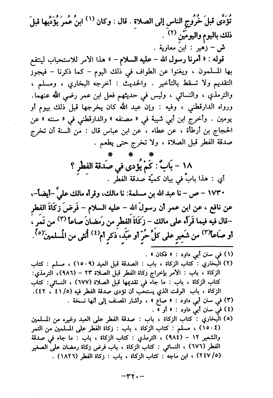 1730- ص- نا عبد الله بن مسلمة: نا مالك، وقرأه مالك عليَّ- أيضاً- عن نافع، عن ابن عمر أن رسولَ الله- عليه السلام- فَرضَ زكَاةَ الفِطرِ - قال فيه فيما قَرَأه على مالك- زَكَاةَ اَلفطرِ من رَمضانَ صاعا (3) من تَمر، أو صاعا (3) من شَعِيرٍ على كل حُرٍ أو عبدٍ، ذكرٍ أم (4) أنثى من المُسلمين. (5)