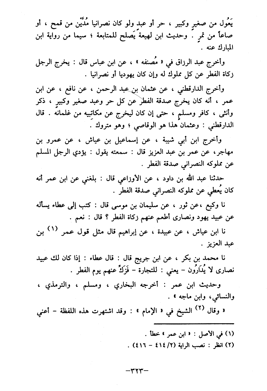 وأخرج الدارقطني، عن عثمان بن عبد الرحمن، عن نافع، عن ابن عمر، أنه كان يخرج صدقة الفطر عن كل حر وعبد صغير وكبيرٍ، ذكر وأنثى، كافر ومسلم، حتى إن كان ليخرج عن مكاتبته من غلمانه. قال الدارقطني: وعثمان هذا هو الوقاصي؛ وهو متروك.