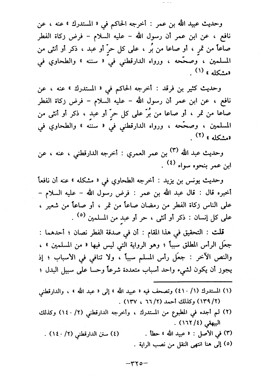 وحديث عبيد الله بن عمر: أخرجه الحاكم في "المستدرك " عنه، عن نافع، عن ابن عمر أن رسول الله- عليه السلام- فرض زكاة الفطر صاعا من تمرِ، أو صاعا من بر، على كل حرِّ أو عبد، ذكر أو أنثى من المسلمين، وصحّحه، ورواه الدارقطني في " سننه " والطحاوي في "مشكله" (1) .