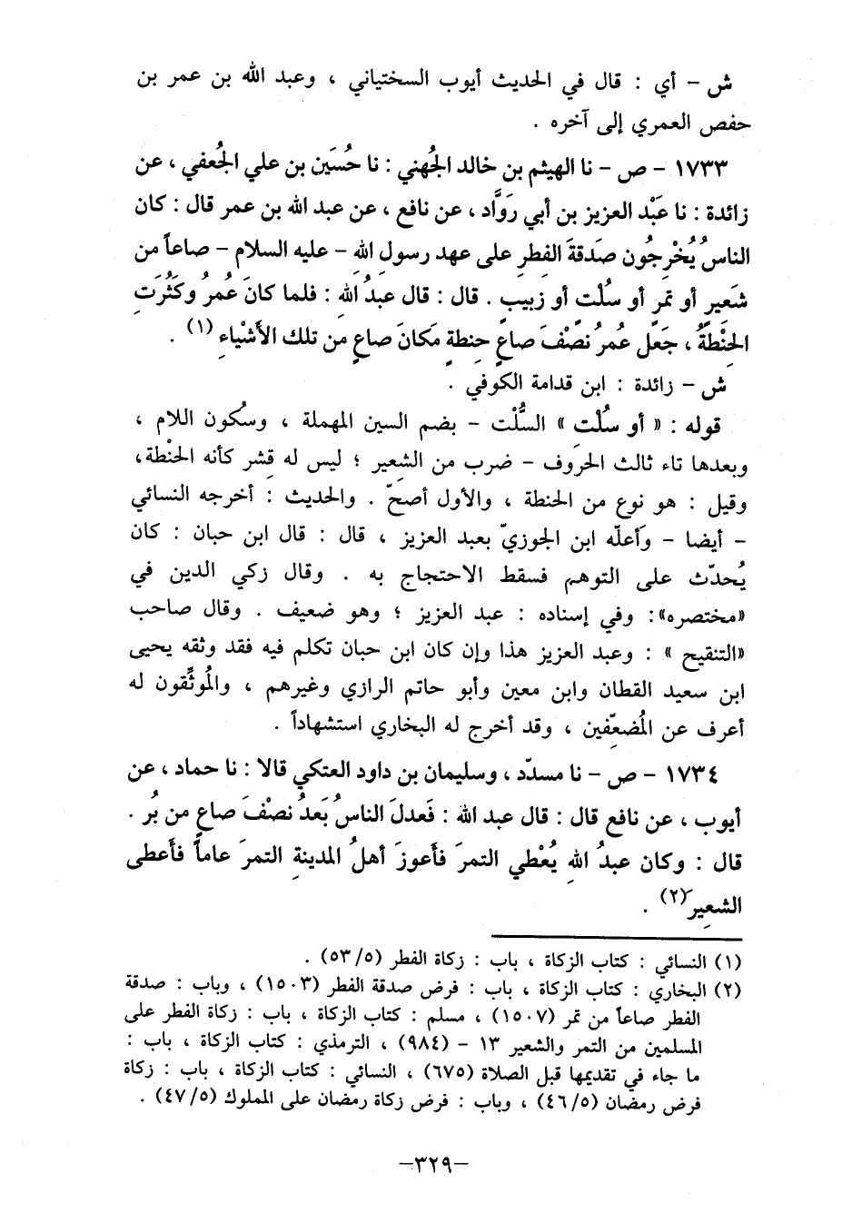 1733- ص- نا الهيثم بن خالد الجُهني: نا حُسَين بن علي الجعفي، عن زائدة: نا عَبْد العزيز بن أبي رَوَّاد، عن نافع، عن عبد الله بن عمر قال: كان الناسُ يُخْرِجُون صَدقةَ الفِطرِ على عهد رسول الله- عليه السلام- صاعا من شَعير أو تمر أو سلت أو زبيب. قال: قال عبَدُ اللهِ: فلما كانَ عُمرُ وكَثُرَت الحِنطة، جَعل عُمرُ نصْفَ صاع حِنطة مَكانَ صاع من تلك الأشْياء (1) .
