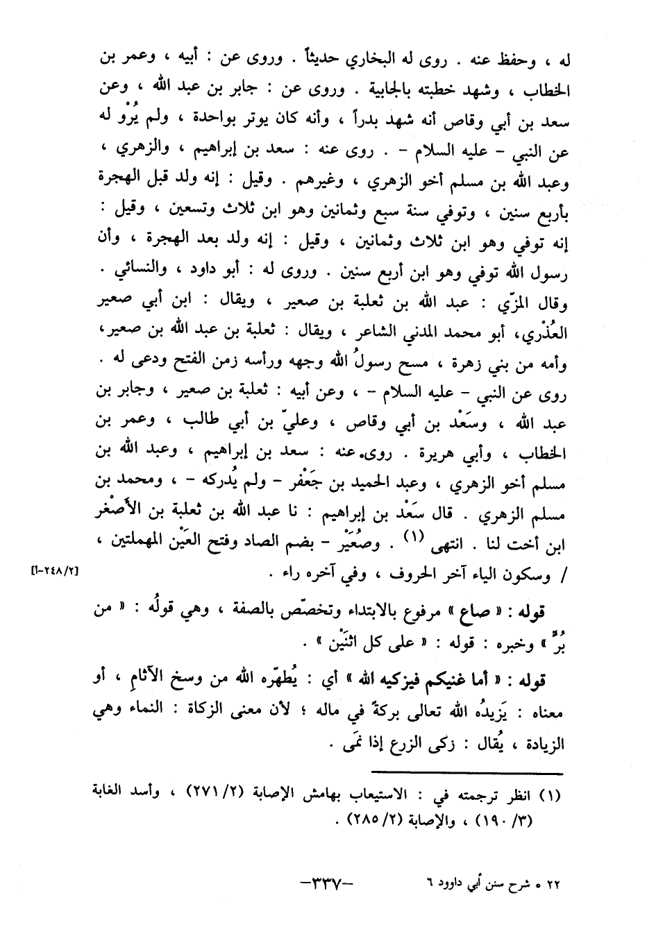 له، وحفظ عنه. روى له البخاري حديثاً وروى عن: أبيه، وعمر بن الخطاب، وشهد خطبته بالرابية. وروى عن: جابر بن عبد الله، وعن سعد بن أبي وقاص أنه شهد بدراً، وأنه كان يوتر بواحدة، ولم يُرو له عن النبي- عليه السلام-. روي عنه: سعد بن إبراهيم، والزهري، وعبد الله بن مسلم أخو الزهري، وغيرهم. وقيل: إنه ولد قبل الهجرة بأربع سنين، وتوفي سنة سبع وثمانين وهو ابن ثلاث وتسعين، وقيل: إنه توفي وهو ابن ثلاث وثمانين، وقيل: إنه ولد بعد الهجرة، وأن رسول الله توفي وهو ابن أربع سنين. وروى له: أبو داود، والنسائي. وقال المزني: عبد الله بن ثعلبة بن صعير، ويقال: ابن أبي صعير العذْري، أبو محمد المدني الشاعر، ويقال: ثعلبة بن عبد الله بن صعير، وأمه من بني زهرة، مسح رسولُ الله وجهه ورأسه زمن الفتح ودعي له. روى عن النبي- عليه السلام-، وعن أبيه: ثعلبة بن صعير، وجابر بن عبد الله، وسَعْد بن أبي وقاص، وعليه بن أبي طالب، وعمر بن الخطاب، وأبي هريرة. روى عنه: سعد بن إبراهيم، وعبد الله بن مسلم أخو الزهري، وعبد الحميد بن جَعْفر- ولم يُدركه-، ومحمد بن مسلم الزهري. قال سَعْد بن إبراهيم: نا عبد الله بن ثعلبة بن الأصْغر ابن أخت لنا. انتهى (1) . وصُعَيْر- بضم الصاد وفتح العَيْن المهملتين، / وسكون الياء آخر الحروف، وفي آخره راء.