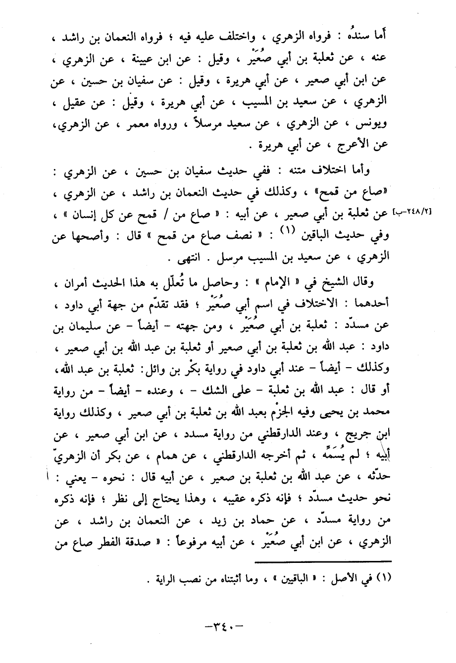 وقال الشيخ في " الإمام ": وحاصل ما تُعمل به هذا الحديث أمران، أحدهما: الاختلاف في اسم أبي صُعَيْر فقد تبلغ من جهة أبي داود، عن مسعد: ثعلبة بن أبي صُعَيْر، ومن جهته- أيضاً عن سليمان بن داود: عبد الله بن ثعلبة بن أبي صعير أو ثعلبة بن عبد الله بن أبي صعير، وكذلك- أيضاً عند أبي داود في رواية بكْر بن وائل: ثعلبة بن عبد الله، أو قال: عبد الله بن ثعلبة- على الشك-، وعنده- أيضا- من رواية محمد بن يحيى وفيه الجزْم بعبد الله بن ثعلبة بن أبي صعير، وكذلك رواية ابن جريج، وعند الدارقطني من رواية مسدد، عن ابن أبي صعير، عن أبيه لم يُسَمه، ثم أخرجه الدارقطني، عن همام، عن بكر أن الزهري حدّثه، عن عبد الله بن ثعلبة بن صعير، عن أبيه قال: نحوه- يعني: "نحو حديث مسدّد " فإنه ذكره عقابه، وهذا يحتاج إلى نظر فإنه ذكره من رواية مسدّد، عن حماد بن زيد، عن النعمان بن راشد، عن الزهري، عن ابن أبي صُعَيْر، عن أبيه مرفوعاً "صدقة الفطر صاع من