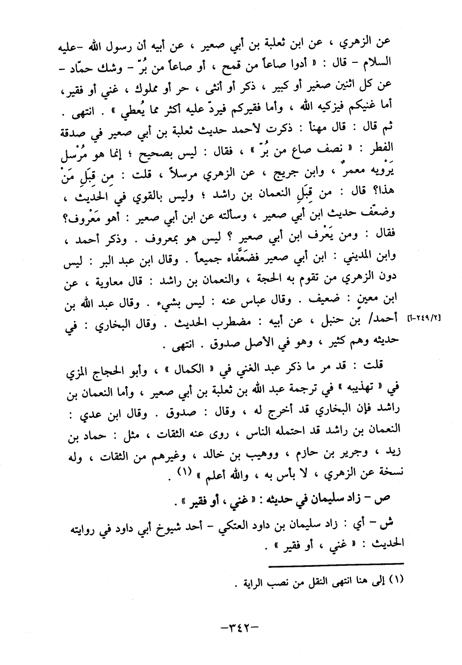 ثم قال: قال مهنأ: ذكرت لأحمد حديث ثعلبة بن أبي صعير في صدقة الفطر: "نصف صاع من بُرّ "، فقال: ليس بصحيح إنما هو مُرْسل