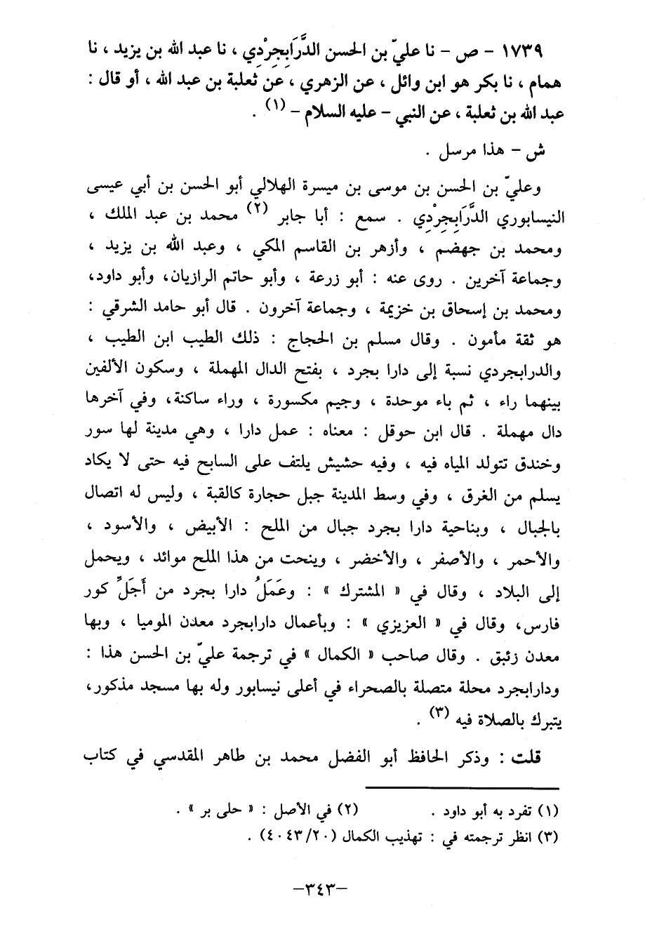 1739- ص- نا علي بن الحسن الدَرَابجِرْدي، نا عبد الله بن يزيد، نا همام، نا بكر هو ابن وائل، عن الزهري، َ عن ثَعلبة بن عبد الله، أو قال: عبد الله بن ثعلبة، عن النبي- عليه السلام- (1) .