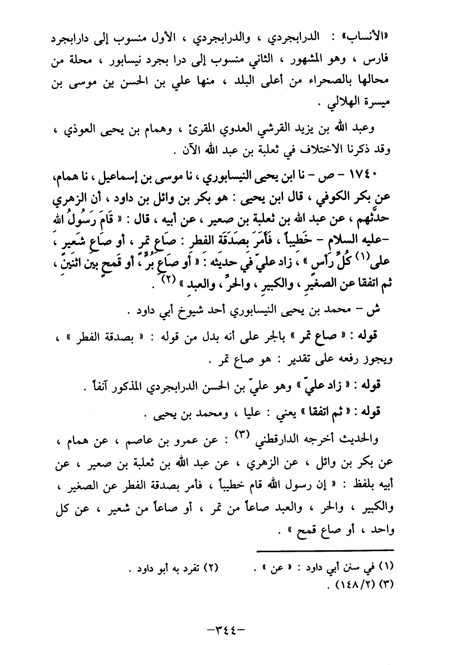 1740- ص- نا ابن يحيى النيسابوري، نا موسى بن إسماعيل، نا همام، عن بكر الكوفي، قال ابن يحيى: هو بكر بن وائل بن داود، أن الزهري حدثهم، عن عبد الله بن ثعلبة بن صعير، عن أبيه، قال: " قَامَ رَسُوِلُ اللهِ - عليه السلام- خَطيبا، فَأمَرَ بِصَدَقَة الفطر: صَاع بمر، أو صَاع شعير، على (1) كُل رَأس "، زاد عليه في حديَثه:" أَو صَاع بر، أو قَمح بين اثنَينً، ثم اتفقا عن الصغير، والكبيرِ، والحرّ، والعبدِ" (2) .