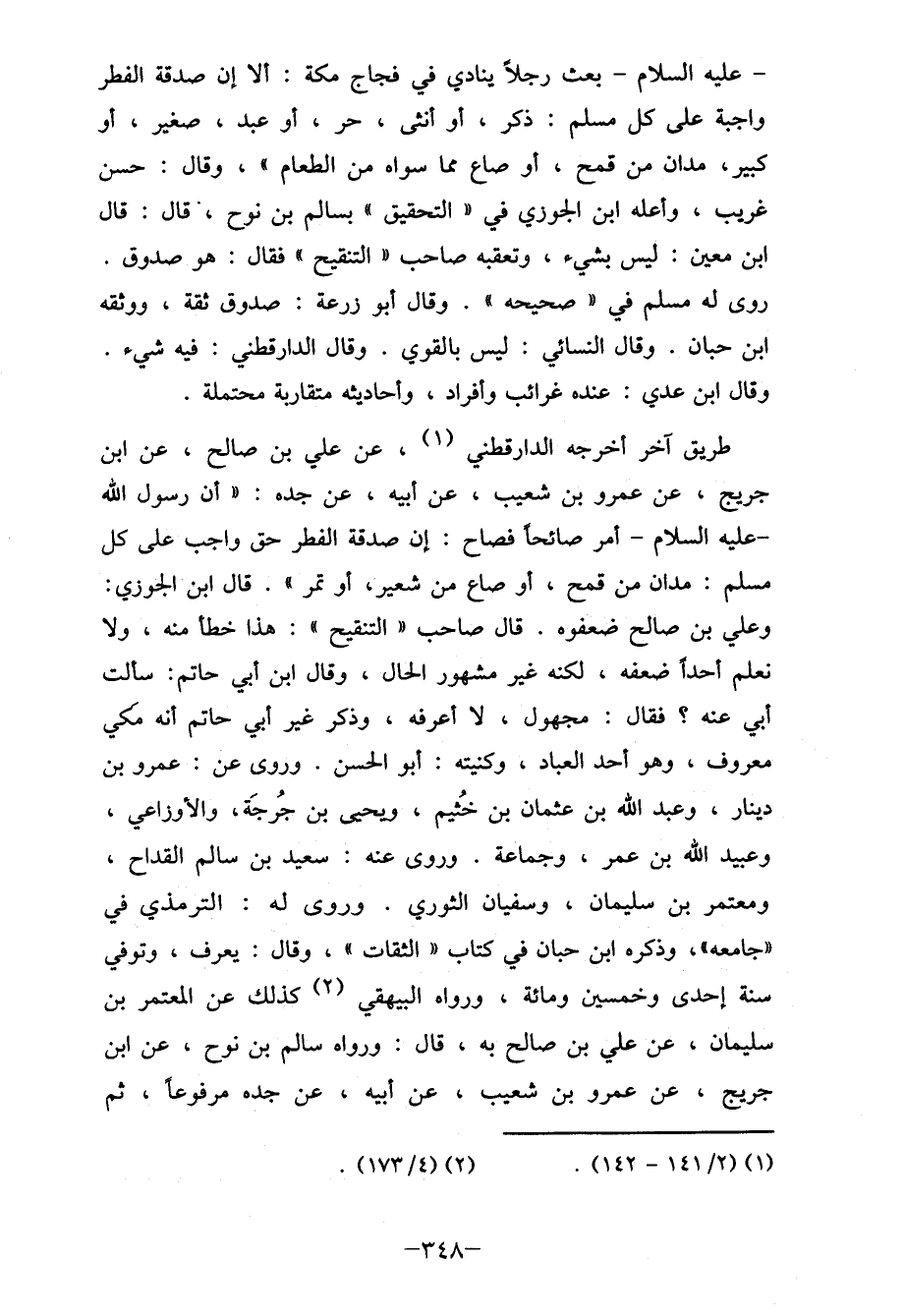 - عليه السلام- بعث رجلاً ينادي في فجاج مكة: ألا إن صدقة الفطر واجبة على كل مسلم: ذكر، أو أنثى، حر، أو عبد، صغير، أو كبير، مدين من قمح، أو صاع مما سواه من الطعام "، وقال: حسن غريب، وأعلن ابن الجوزي في "التحقيق " بسالم بن نوح، قال: قال ابن معين: ليس بشيء، وتعقبه صاحب " التنقيح" فقال: هو صدوق. روى له مسلم في " صحيحه ". وقال أبو زرعة: صدوق دقة، ووثقه ابن حبان. وقال النسائي: ليس بالقوي. وقال الدارقطني: فيه شيء. وقال ابن عدي: عنده غرائب وأفراد، وأحاديثه متقاربة محتملة.