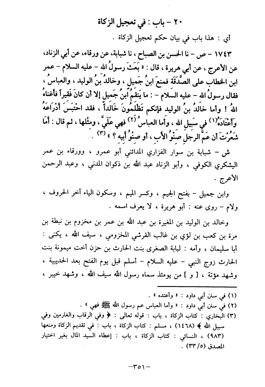 1743- ص- نا الحسن بن الصباحِ، نا شبابة، عن ورقاء، عن أبي الزياد، عن الأعرج، عن أبي هريرة، قال: " بعَثَ رسولُ الله- عليه السلام- عمر ابن الخطاب على الصَدَقَة فمنعَ ابنُ جَميلٍ، وخالدُ بَني الوليد، والعباسُ، فقال رسولُ الله- عليه السَلام-: ما يَنقَمُ ابنُ جَميلٍ إلا أن كانَ فَقيراً فأغناهُ اللهُ! وأما خاَلدُ بنُ الوليد فإنكم تَظلَمُونَ خَالَداً، فقد احْتبَسً أَدْرَاعَهُ وَأَعْتَادَه (1) في سَبيلِ الله، وَأما العباسُ (2) فهي عَلَيَّ، ومِثْلها، ثم قال: أَمَا شَعُرْتَ أن عَمَ الرجالِ صَنْوُ الأبِ، أو صِنْوُ أَبِيهِ؟ " (3) .