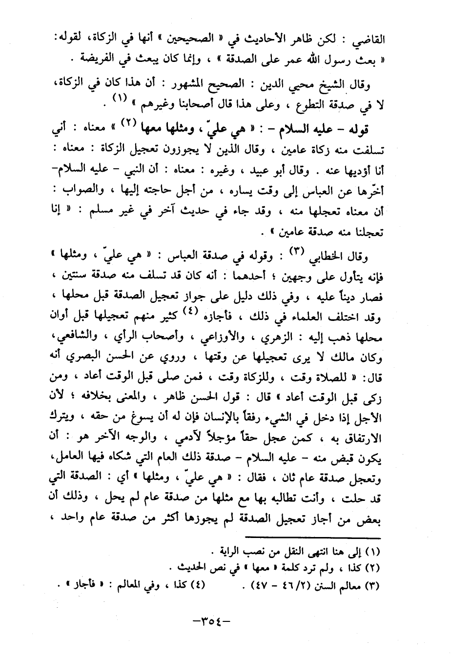 وقال الخطابي (3) : وقوله في صدقة العباس: "هي عليه، ومثلها" فإنه يتأول على وجهين أحدهما: أنه كان قد تسلف منه صدقة سنتين، فصار دينا عليه، وفي ذلك دليل على جواز تعجيل الصدقة قبل محلها، وقد اختلف العلماء في ذلك، فأجازه (4) كثير منهم تعجيلها قبل أوان محلها ذهب إليه: الزهري، والأوزاعي، وأصحاب الرأي، والشافعي، وكان مالك لا يرى تعجيلها عن وقتها، وروي عن الحسن البصري أنه قال: " للصلاة وقت، وللزكاة وقت، فمن صلى قبل الوقت أعاد، ومن زكى قبل الوقت أعاد" قال: قول الحسن ظاهر، والمعنى بخلافه لأن الأجل إذا دخل في الشيء رفقا بالإنسان فإن له أن يسوغ من حقه، ويترك الارتفاع به، كمن عجل حقا مسجلاً لأدمي، والوجه الأخر هو: أن يكون قبض منه- عليه السلام- صدقة ذلك العام التي شكاه فيها العامل، وتعجل صدقة عام ثان، فقال: " هي عليه، ومثلها" أي: الصدقة التي قد حلت، وأنت تطالبه بها مع مثلها من صدقة عام لم يحل، وذلك أن بعض من أجاز تعجيل الصدقة لم يجزها أكثر من صدقة عام واحد،