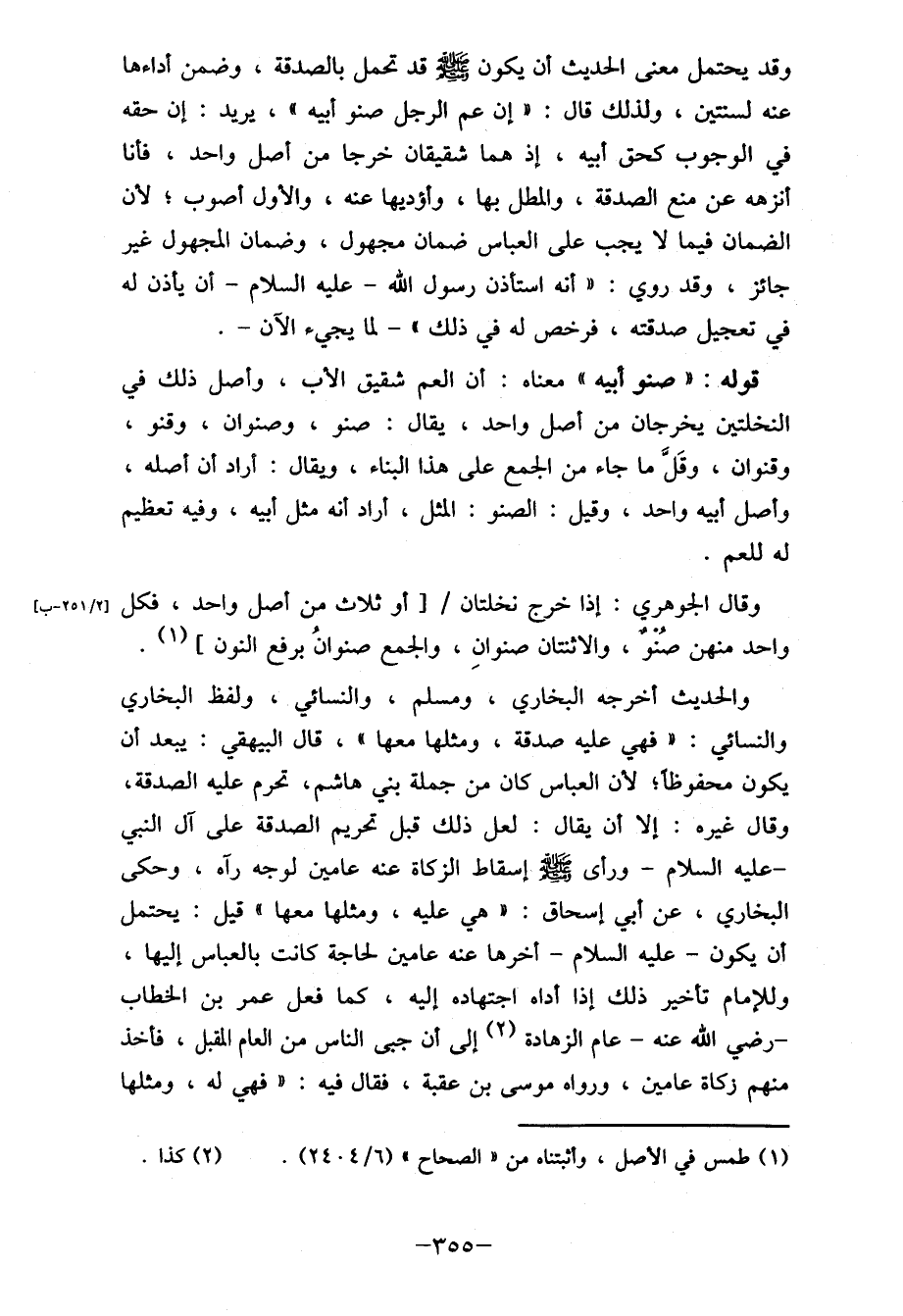 وقد يحتمل معنى الحديث أن يكون صلى الله عليه وسلم قد تحمل بالصدقة، وضمن أداءها عنه لسنتين، ولذلك قال:" إن عم الرجل صنو أبيه "، يريد: إن حقه في الوجوب كحق أبيه، إذ هما شقيقان خرجا من أصل واحد، فأنا أنزهه عن منع الصدقة، والمطل بها، وأؤديها عنه، والأول أصوب لأن الضمان فيما لا يجب على العباس ضمان مجهول، وضمان المجهول غير جائز، وقد روي: " أنه استأذن رسول الله- عليه السلام- أن يأذن له في تعجيل صدقته، فرخص له في ذلك"- لما يجيء الآن-.