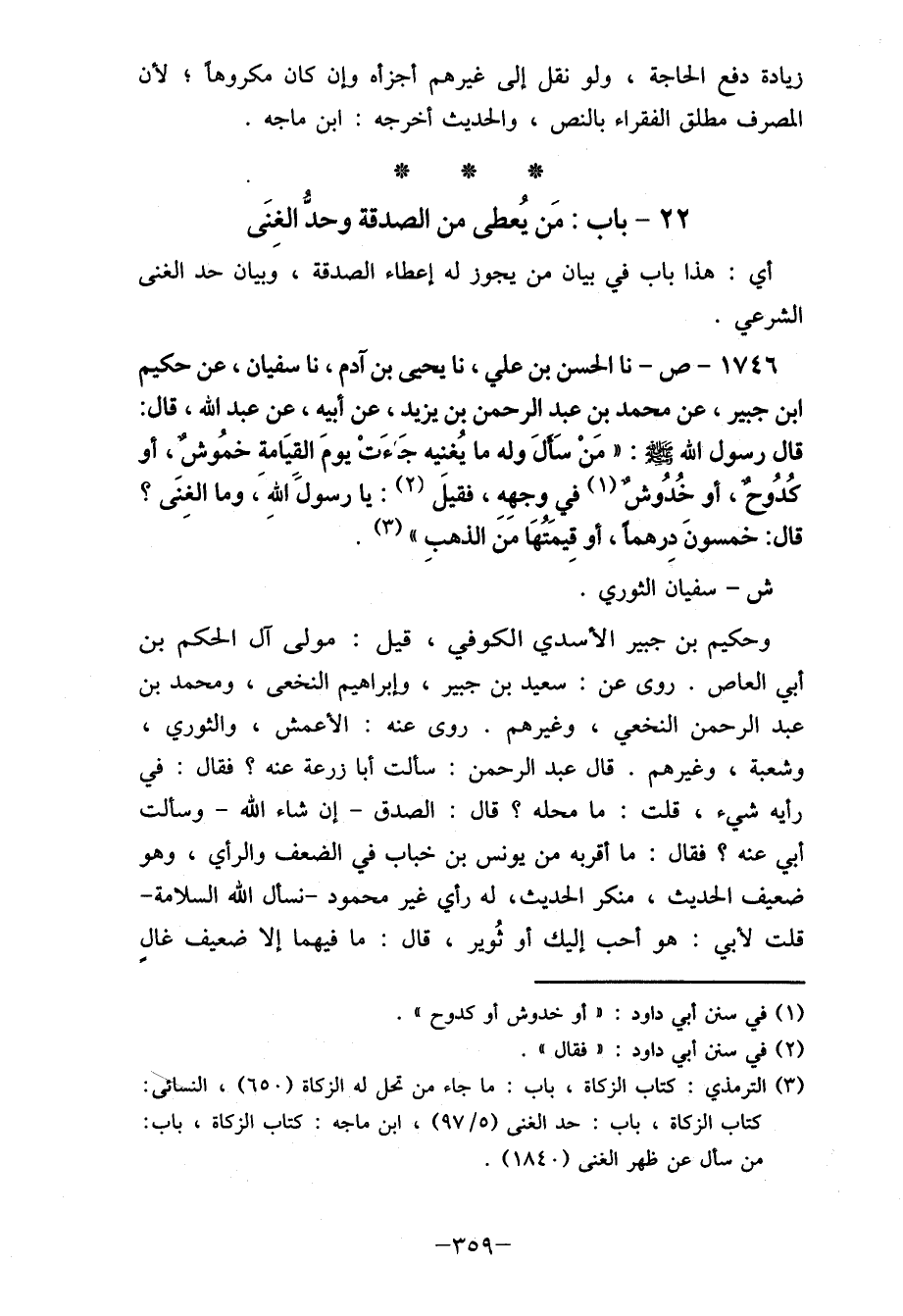 1746- ص- نا الحسن بن علي، نا يحيى بن آدم، نا سفيان، عن حكيم ابن جبير، عن محمد بن عبد الرحمن بن يزيد، عن أبيه، عن عبد الله، قال: قال رسول الله صلى الله عليه وسلم: "مَنْ سَألَ وله ما يُغنيه جاءت يومَ القيامة خمُوشٌ، أو كُدُوح، أو خُدوشٌ (1) في وجهِه، فقيلَ (2) : يا رسوله اللهِ، وما الغِنَى؟ قال: خمسونَ درهما، أو قِيمَتُهَا منذ الذهبِ " (3) .