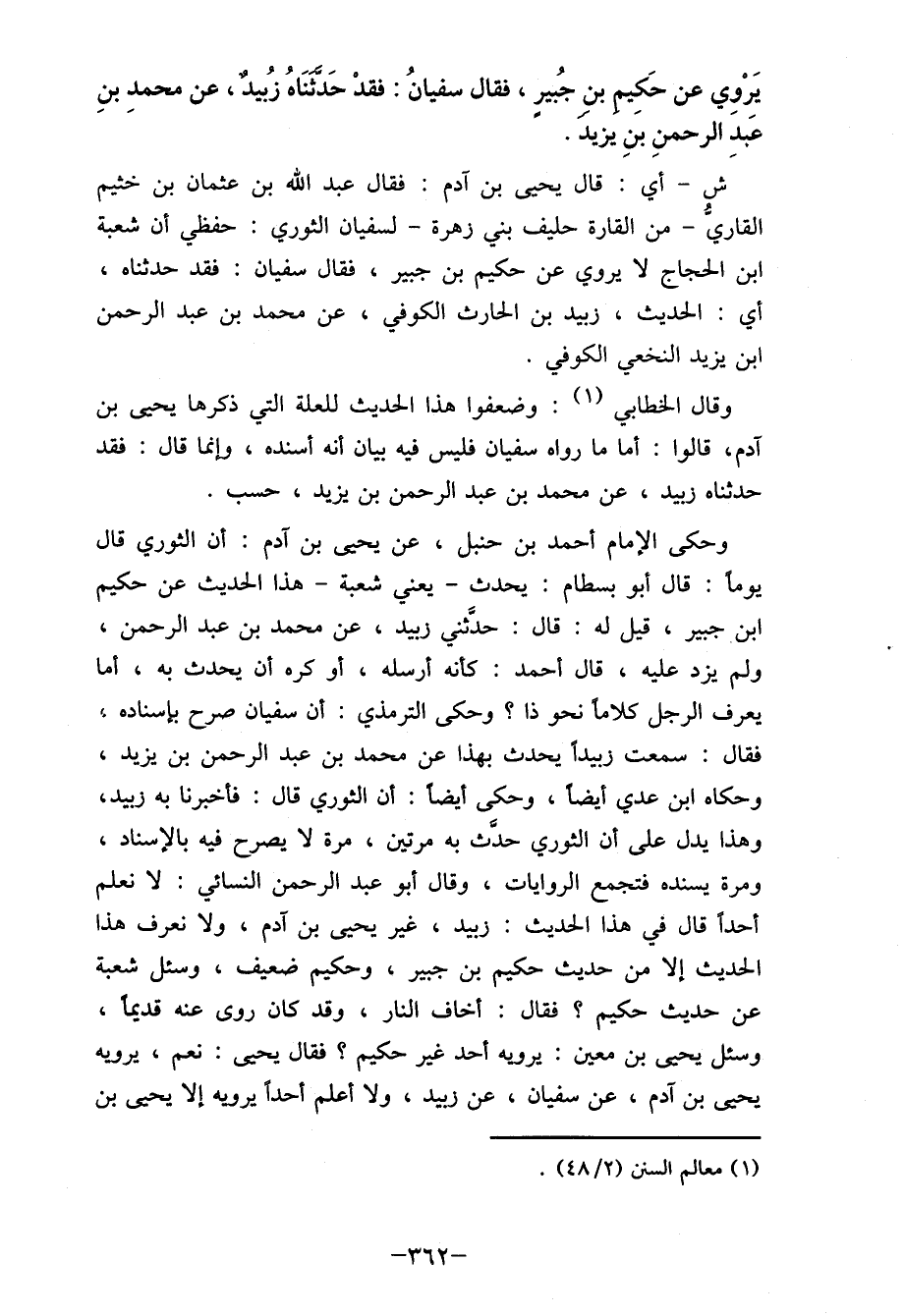 وحكى الإمام أحمد بن حنبل، عن يحيى بن آدم: أن الثوري قال يوماً قال أبو بسطام: يحدث- يعني شعبة- هذا الحديث عن حكيم ابن جبير، قيل له: قال: حدَثني عبيد، عن محمد بن عبد الرحمن، ولم يزد عليه، قال أحمد: كأنه أرسله، أو كره أن يحدث به، أما يعرف الرجل كلاما نحو ذا؟ وحكى الترمذي: أن سفيان صرح بإسناده، فقال: سمعت زبيدا يحدث بهذا عن محمد بن عبد الرحمن بن يزيد، وحكاه ابن عدي أيضا، وحكى أيضاً أن الثوري قال: فأخبرنا به عبيد، وهذا يدل على أن الثوري حيث به مرتين، مرة لا يصرح فيه بالإسناد، ومرة يسنده فتجمع الروايات، وقال أبو عبد الرحمن النسائي: لا نعلم أحدا قال في هذا الحديث: زايد، غير يحيى بن آدم، ولا نعرف هذا الحديث إلا من حديث حكيم بن جبير، وحكيم ضعيف، وسئل شعبة عن حديث حكيم؟ فقال: أخاف النار، وقد كان روى عنه قديماً وسئل يحيى بن معين: يرويه أحد غير حكيم؟ فقال يحيى: نعم، يرويه يحيى بن آدم، عن سفيان، عن عبيد، ولا أعلم أحدا يرويه إلا يحيى بن