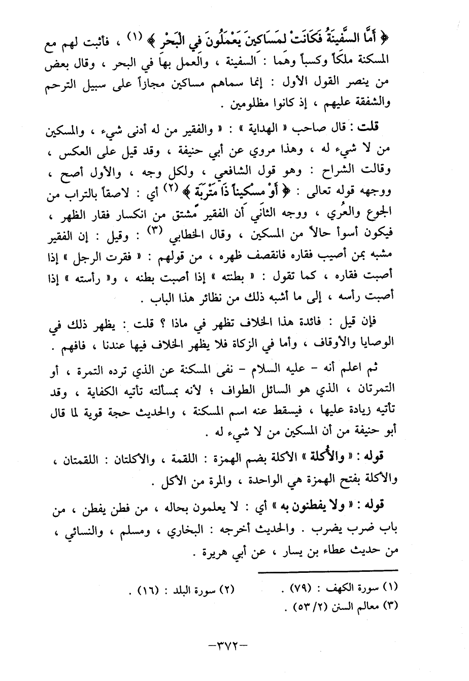 ( {أما السفينَةُ فَكَانَتْ لمَسَاكينَ يَعْمَلُونَ في البَحْرِ} (1) ، فأثبت لهم مع المسكنة ملكَا وكسبا وهَما: َ السفينة، والعمل بها في البحر، وقال بعض من ينصر القول الأول: إنما سماهم مساكين مجازاً على سبيل الترحم والشفقة عليهم، إذ كانوا مظلومين.