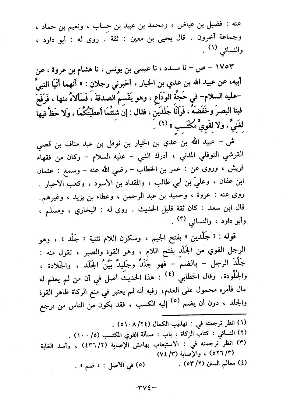 1753- ص- نا مسدد، نا عيسى بن يونس، نا هشام بن عروة، عن أبيه، عن عبيد الله بن عدي بن الخيار، أخبرني رجلانِ: " أَنهما أتَيا النبيَّ - عليه السلامِ- في حَجَّةِ الوَدَاع، وهو يَقْسمُ الصدقةَ، فَسَألاهُ منها، فَرَفَعَ فينا البصرَ وخفَضَهُ، فَرآنَا جَلدين، فقال: أنَ شئتُمَا أعطَيْتُكُمَا، وَلا حظ فيها لِغَنِيّ، ولا لِقَوِيّ مكتَسِبِ " (2) .