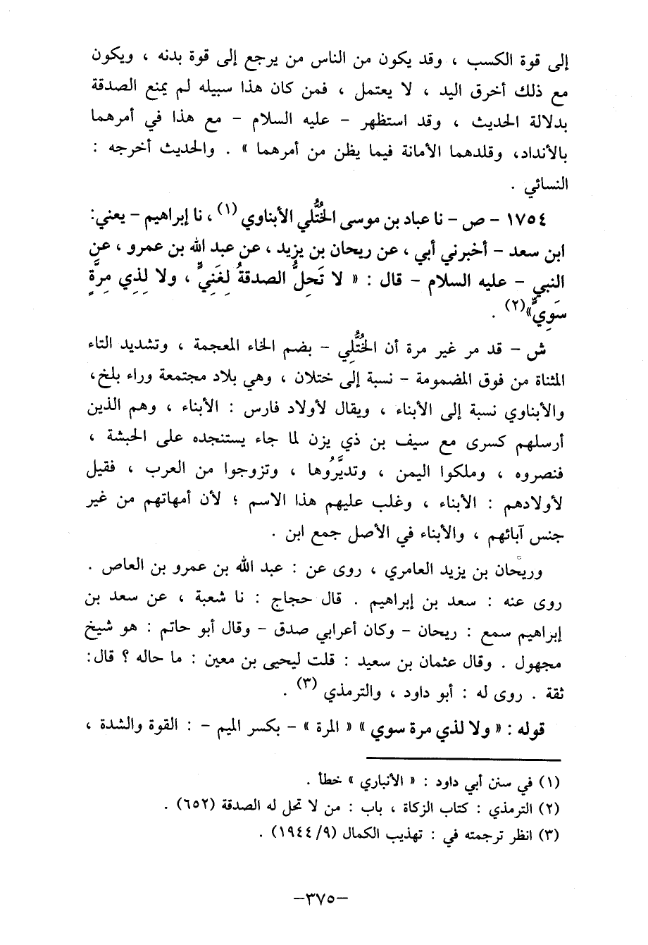 1754- ص- نا عباد بن موسى الختُلي الأبناوي (1) ، نا إبراهيم- يعني: ابن سعد- أخبرني أبي، عن ريحان بن يزيد، عن عبد الله بن عمرو، عن النبي - عليه السلام- قال: " لا تَحِل الصدقةُ لِغَنِي، ولا لِذِي مِرةٍ سَوِي ".