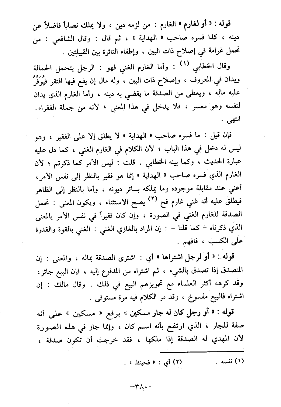 فإن قيل: ما فسره صاحب "الهداية " لا يطلق إلا على الفقير، وهو ليس له دخل في هذا الباب لأن الكلام في الغارم الغني، كما دل عليه عبارة الحديث، وكما بينه الخطابي. قلت: ليس الأمر كما ذكرتم لأن الغارم الذي فسره صاحب " الهداية " إنما هو فقير بالنظر إلى نفس الأمر، أعني عند مقابلة موجودة وما يملكه بسائر ديونه، وأما بالنظر إلى الظاهر فيطلق عليه أنه غني غارم في (2) يصح الاستثناء، ويكون المعنى: تحمل الصدقة للغارم الغني في الصورة، وإن كان فقيرا في نفس الأمر بالمعنى الذي ذكرناه- كما قلنا-: إن المراد بالغازي الغني: الغني بالقوة والقدرة على الكسب، فافهم.