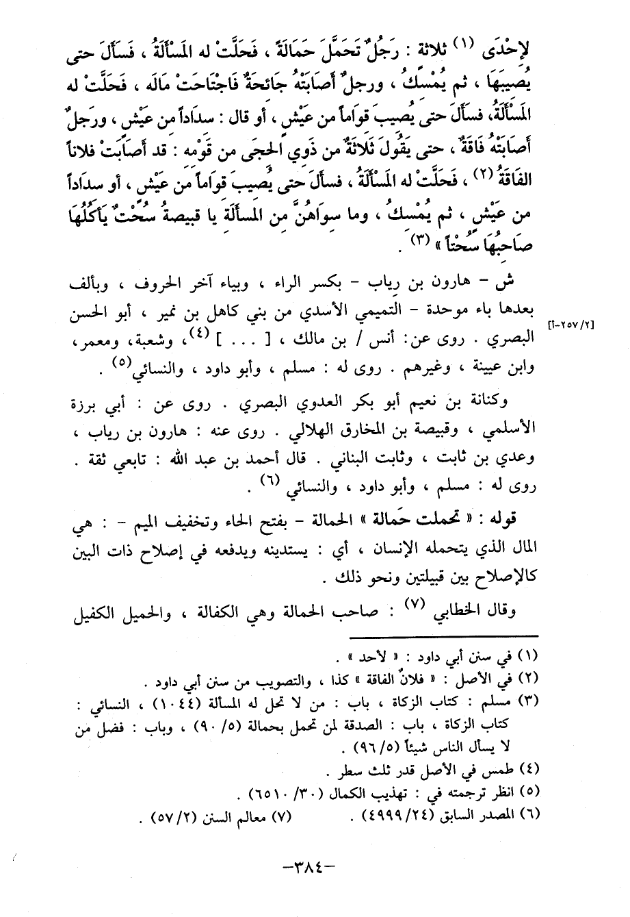 (3) مسلم: كتاب الزكاة، باب: من لا تحل له المسألة (1044) ، النسائي: كتاب الزكاة، باب: الصدقة لمن تحمل بحمالة (5/ 90) ، وباب: فضل من لا يسأل الناس شيئا (5/ 96) .