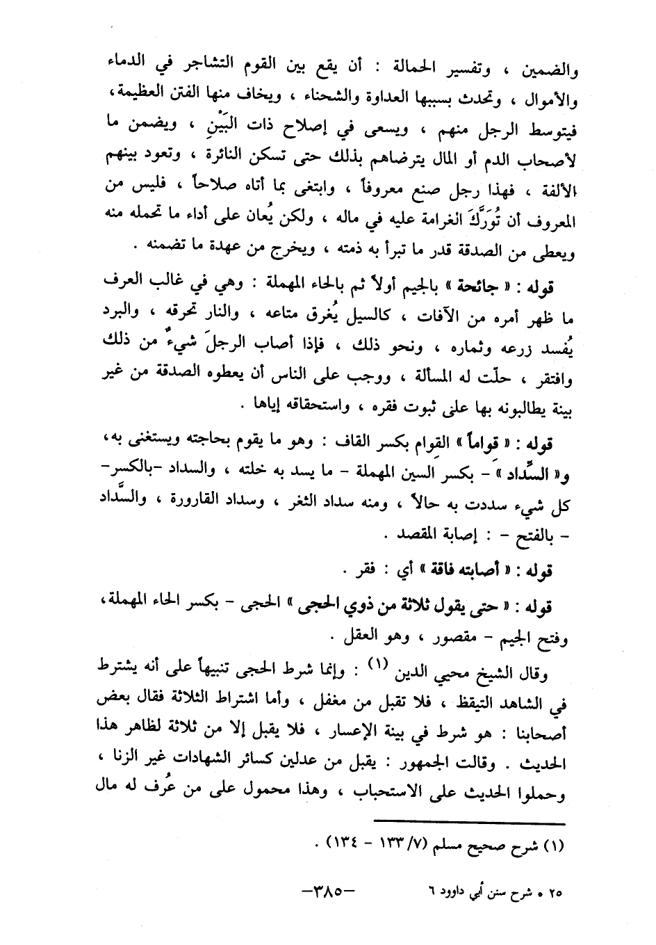 والضمين، وتفسير الحمالة: أن يقع بين القوم التشاجر في الدماء والأموال، وتحدث بسببها العداوة والشحناء، ويخاف منها الفتن العظيمة، فيتوسط الرجل منهم، ويسعى في إصلاح ذات البينِ، ويضمن ما لأصحاب الدم أو المال يترضاهم بذلك حتى تسكن النائرة، وتعود بينهم الألفة، فهذا رجل صنع معروفاً وابتغى بما أتاه صلاحا فليس من المعروف أن تُوَرك الغرامة عليه في ماله، ولكن يُعان على أداء ما تحمله منه ويعطى من الصدقة قدر ما تبرأ به ذمته، ويخرج من عهدة ما تضمنه. قوله: "جائحة " بالجيم أولا ثم بالحاء المهملة: وهي في غالب العرف ما ظهر أمره من الآفات، كالسيل يُغرق متاعه، والنار تحرقه، والبرد يُفسد زرعه وثماره، ونحو ذلك، فإذا أصاب الرجلَ شيء من ذلك وافتقر، حلت له المسألة، ووجب على الناس أن يعطوه الصدقة من غير بينة يطلبونه بها علي ثبوت فقره، واستحقاقه إياها.