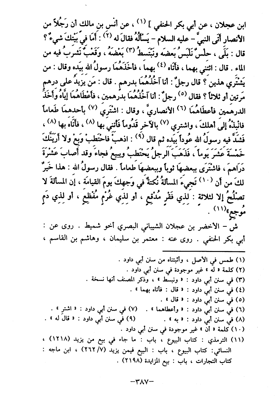 ابن عجلان، عن أبي بكر الحنفي] (1) ، عن أنس بن مالكٍ أن رَجُلاً من الأنصارِ أَتَى النبيَّ- عليه السلام- يَسْألُهُ فقال له (2) :َ أمَا فِيِ بَيْتِكَ شيءٌ؟ قال: بَلَى، حلسٌ نَلبس بَعضَه ونَبْتَسطُ (3) بَعْضَهُ، وَقَعْبٌ تشربُ فيه من الماء. قال: ائتَني بهما، فأتَاه (4) بهما، فأخَذهَما رسولُ اللهِ بِيَده وقال: من يَشْتري هذينَ؟ قال رجلٌ: أنا آخذهما بدرهم. قال: مَن يزيد على درهم مرتينِ أو ثلاثاً فقال (5) رجلٌ: أنا آخذهما بدرهمينِ، فأعطاهُمَا إياهُ وأخَذَ الدرهمينِ فأعطاهُمَا (6) الأنصاريَّ، وقال: اشْتَرِي (7) بأحدهمَا طَعاما فانْبِذْهُ إلى أهلكَ، واشتري (7) بالآخر قَدوما فَأتِنِي بها (8) ، فأتاهَ بها (8) ، فَشَد فيهِ رسوَلُ الله عُودا بيَده ثم قال (9) : اذهبْ فاحْتَطبْ وَبِعْ ولا أرَينَّكَ خَمْسَةَ عَشَرَ يَوما، فَذهب اَلرجلُ يَحْتَطبُ ويبيعُ فجاء وقد أصابَ عَشْرَةَ درَاهمَ، فاشْتَرَى ببعضِهَا ثوبا وببعضِهَا طَعاما. فقال رسولُ الله: هذا خَيرٌ لكَ من أَن (5) تَجِيءَ المسألةُ نُكتةٌ في وَجهِكَ يومَ القيامة، إنه المسألةَ لا تصْلُحُ إلا لثلاثةٍ: لِذِي فَقْرٍ مُدْقِعٍ، أو لِذِي غُرْم مُفْظِع، أو لِذِي دَمٍ مُوجِعٍ " (11) .