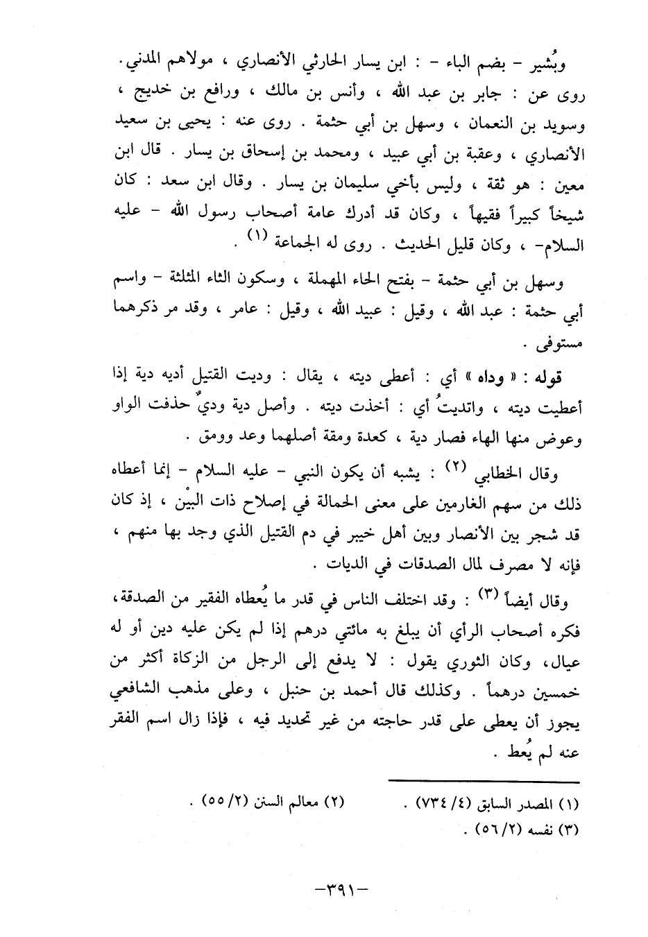 وقال الخطابي (2) : يشبه أن يكون النبي- عليه السلام- إنما أعطاه ذلك من سهم الغارمين على معنى الحمالة في إصلاح ذات البين، إذ كان قد شجر بين الأنصار وبن أهل خيبر في دم القتيل الذي وجد بها منهم، فإنه لا مصرف لمال الصدقات في الديات.