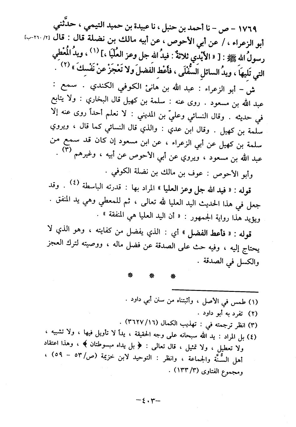 1769- ص- نا أحمد بن حنبل، نا عبيدة بن حميد التيمي، حدَّثني أبو الزعراء،/ عن أبي الأحوص، عن أبيه مالك بن نضله قال: قال رسولُ الله صلى الله عليه وسلم: [" الأيْدي ثلاثةٌ: فيدُ الله جل وعز العُليا] ، (1) ، ويدُ المُعْطِي التي تَلِيهَاَ، ويدُ السائلِ اَلسفْلَى، فأعْطِ الَفضلَ ولا تَعْجَزْ عنْ نَفْسِكَ " (2) .