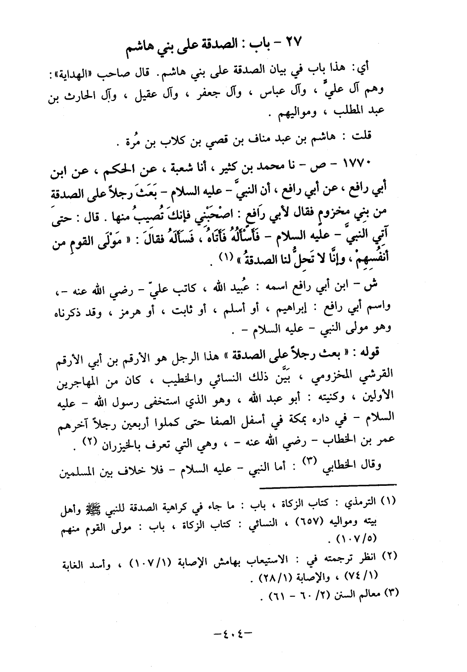 1770- ص- نا محمد بن كثير، أنا شعبة، عن الحكم، عن ابن أبي رافع، عن أبي رافع، أن النبي- عليه السلام- بَعَثَ رجلاً على الصدقةِ من بنِي مخزوم فقال لأبي رَافع: اصْحَبْنِي فإنكَ تُصيبُ منها. قال: حتى آتي النبيَّ- عليه السلام- فَأسْألُهُ فَأتَاهُ، فَسَألَهُ فقالت: " مَوْلَى القوم من أنفُسِهِمْ، وإنا لا تَحِلُّ لنا الصدقةُ" (1) .