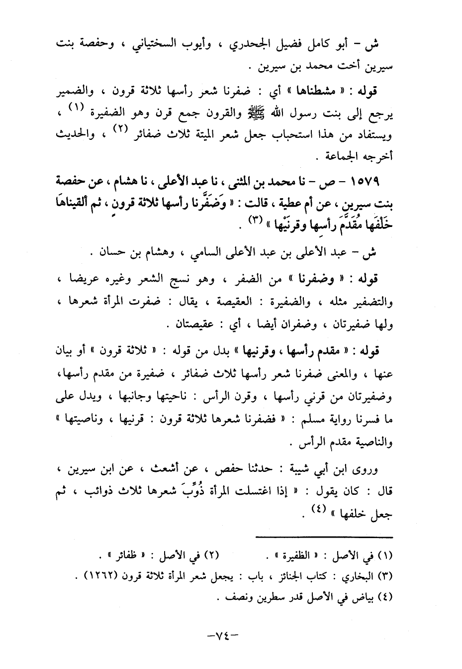 1579- ص- نا محمد بن المثنى، نا عبد الأعلى، نا هشام، عن حفصة بنت سيرين، عن أم عطية، قالت: " وَضَفرنا رأسها ثلاثة قرون، ثم ألقيناهَا خَلفَها مُقَدَّم رأسِها وقرنيْها " (3) .