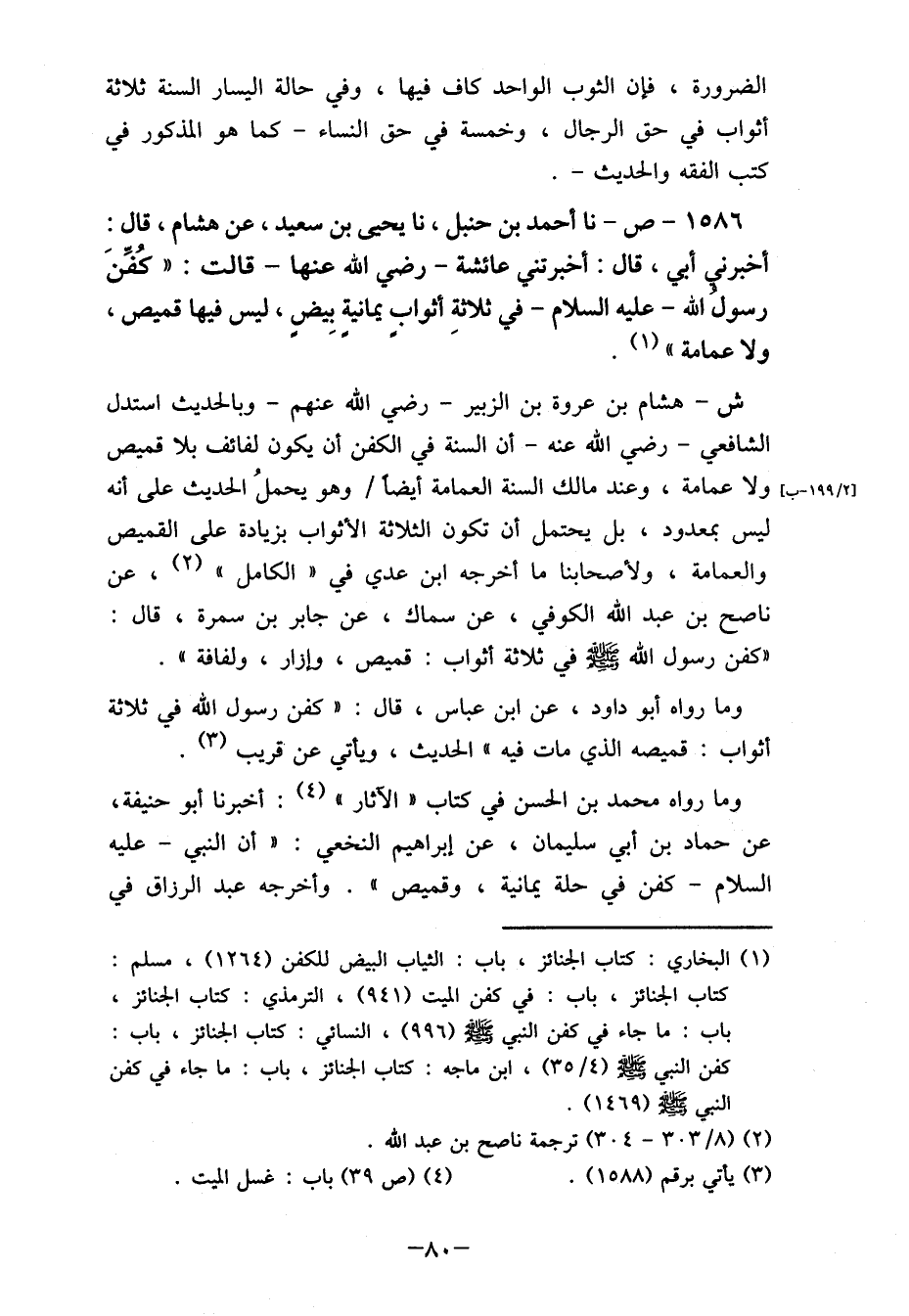 1586- ص- نا أحمد بن حنبل، نا يحيى بن سعيد، عن هشام، قال: أخبرني أبي، قال: أخبرتني عائشة- رضي الله عنها- قالت: "كُفِّنَ رسول الله- عليه السلام- في ثلاثة أثواب ثمانية بيضٍ، ليس فيها قميص، ولا عمامة " (1) .َ