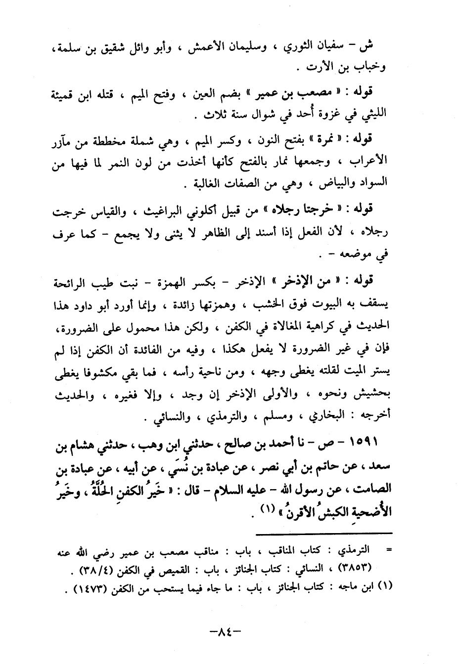 1591- ص- نا أحمد بن صالح، حدثنا ابن وهب، حدثني هشام بن سعد، عن حاتم بن أبى نصر، عن عبادة بن نُسَي، عن أبيه، عن عبادة بن الصامت، عن رسول الله- عليه السلام- قال: "خَيرُ الكفنِ الحُلةُ، وخَيرُ الأضحية الكبشُ الأقرنُ" (1) .