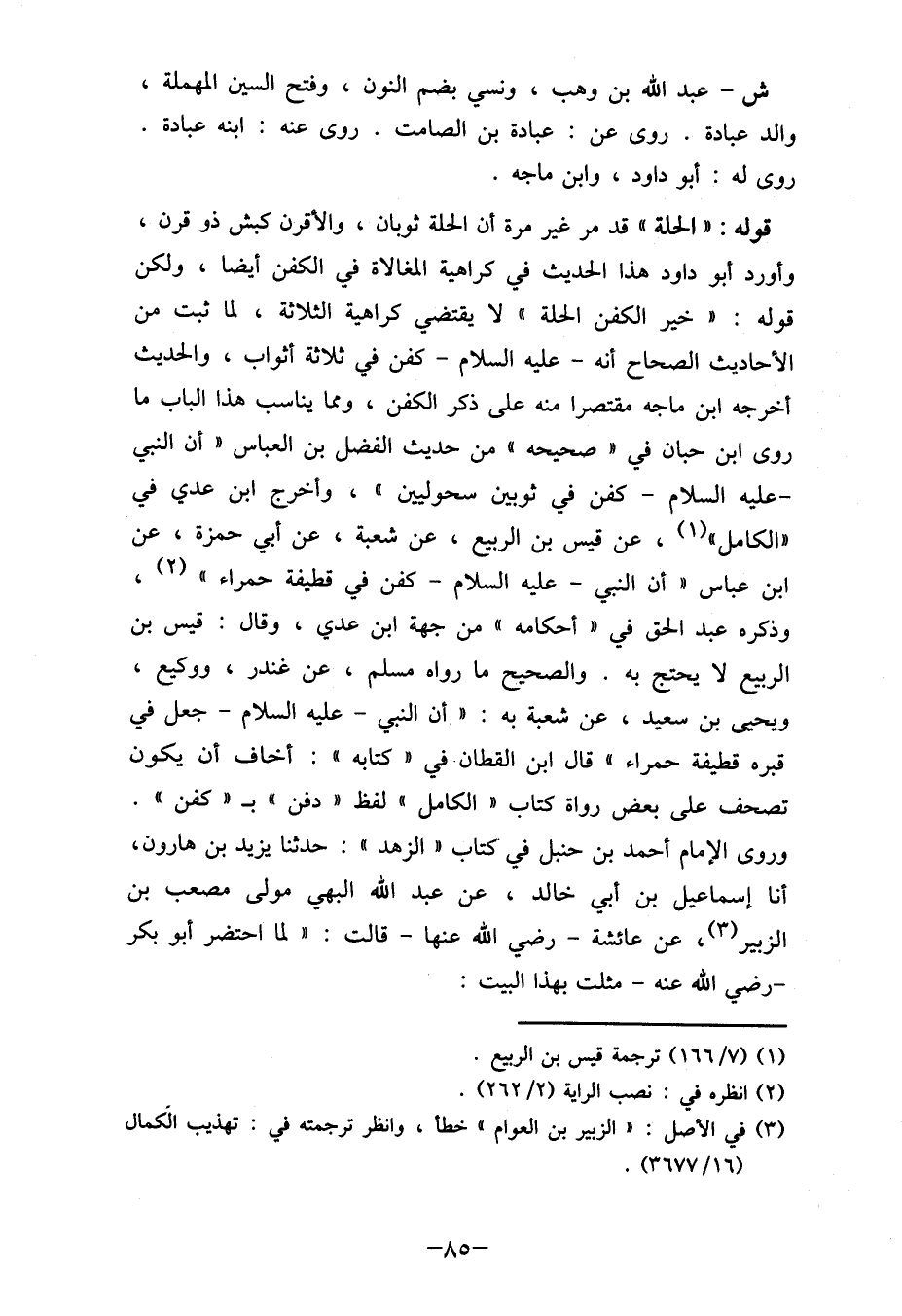قوله: " الحلة " قد مر غير مرة أن الحلة ثوبان، والأقرن كبش ذو قرن، وأورد أبو داود هذا الحديث في كراهية المغالاة في الكفن أيضا، ولكن قوله: "خير الكفن الحلة " لا يقتضي كراهية الثلاثة، لما ثبت من الأحاديث الصحاح أنه- عليه السلام- كفن في ثلاثة أثواب، والحديث أخرجه ابن ماجه مقتصرا منه على ذكر الكفن، ومما يناسب هذا الباب ما روى ابن حبان فيه صحيحه، من حديث الفضل بن العباس " أن النبي - عليه السلام- كفن في ثوبين سحوليين "، وأخرج ابن عدي في "الكامل " (1) ، عن قيس بن الربيع، عن شعبة، عن أبي حمزة، عن ابن عباس "أن النبي- عليه السلام- كفن في قطيفة حمراء" (2) ، وذكره عبد الحق في "أحكامه " من جهة ابن عدي، وقال: قيس بن الربيع لا يحتج به. والصحيح ما رواه مسلم، عن بندر، ووكيع، ويحي بن سعيد، عن شعبة به: " أن النبي- عليه السلام- جعل في قبره قطيفة حمراء" قال ابن القطان في " كتابه": أخاف أن يكون تصحف على بعض رواة كتاب " الكامل " لفظ "دفن " بـ "كفن ". وروى الإمام أحمد بن حنبل في كتاب " الزهد ": حدثنا يزيد بن هارون، أنا إسماعيل بن أبي خالد، عن عبد الله البهي مولى مصعب بن الزبير (3) ، عن عائشة- رضي الله عنها- قالت: " لما احتضر أبو بكر - رضي الله عنه- مثلت بهذا البيت: