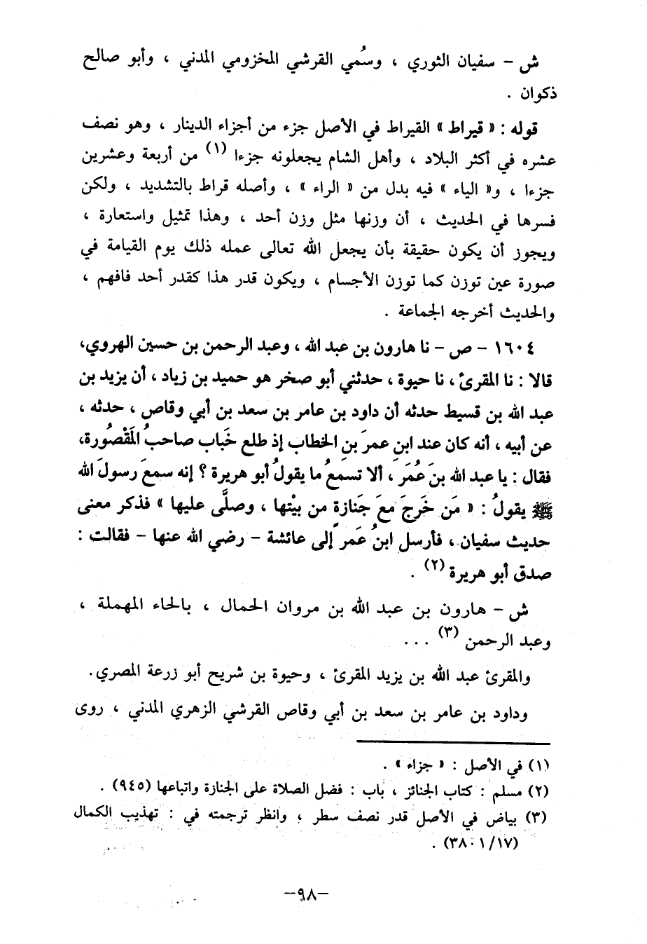 1604- ص- نا هارون بن عبد الله، وعبد الرحمن بن حسين الهرمي، قالا: نا المقرئ، نا حيوة، حدثنا أبو صخر هو حميد بن زياد، أن يزيد بن عبد الله بن قسيط حدثه أن داود بن عامر بن سعد بن أبي وقاص، حدثه، عن أبيه، أنه كان عند ابنِ عمرَ بنِ الخطاب إذ طلع خَباب صاحبُ المَقْصُورة فقال: يا عبد الله بنَ عُمَر، ألا تسمعُ ما يقولُ أبو هريرة؟ إنه سمعَ رسولَ الله صلى الله عليه وسلم يقولُ: "مَن خَرجَ معَ جَنازة من بيْتها، وصلى عليها" فذكر معنى حديث سفيان، فأرسل ابنُ عَمر إلى عائشة- رضي الله عنهاَ فقالت: صدق أبو هريرة (2) .