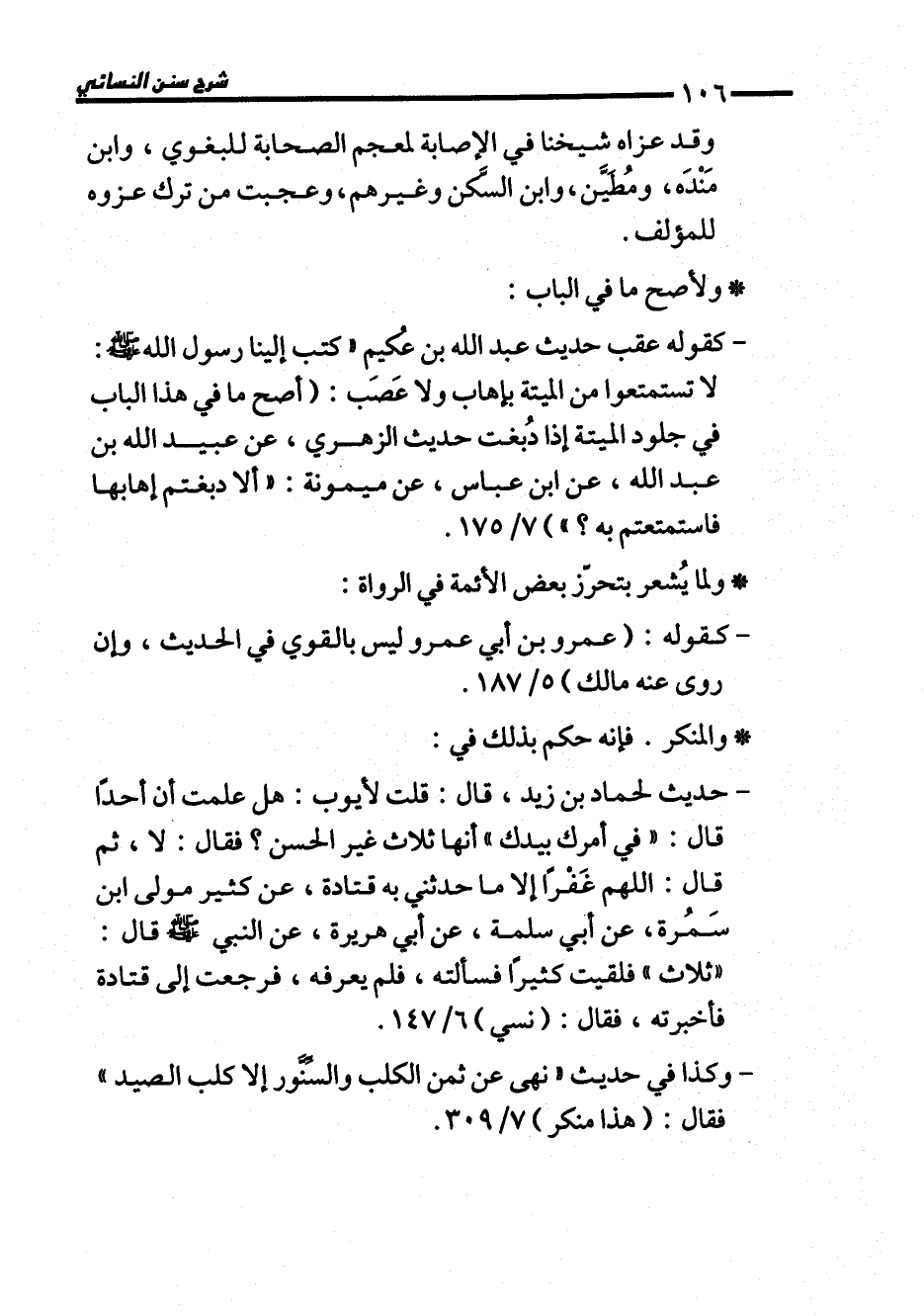 - كقوله عقب حديث عبد الله بن عُكيم "كتب إلينا رسول الله - صلى الله عليه وسلم -: لا تستمتعوا من الميتة بإهاب ولا عَصَب: (أصح ما في هذا الباب في جلود الميتة إذا دُبغت حديث الزهري، عن عبيد الله بن عبد الله، عن ابن عباس، عن ميمونة: "ألا دبغتم إهابها فاستمتعتم به؟ ") 7/ 175.