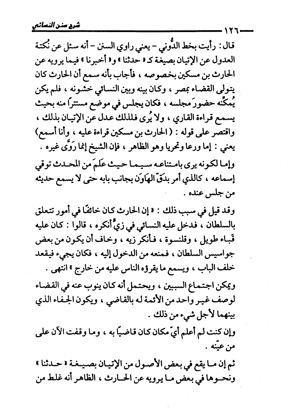 قال: رأيت بخط الدُّوني -يعني راوي السنن- أنه سئل عن نُكتة العدول عن الإتيان بصيغة كـ"حدثنا" و "أخبرنا" فيما يرويه عن الحارث بن مسكين بخصوصه، فأجاب بأنه سمع أن الحارث كان يتولى القضاء بمصر، وكان بينه وبين النسائي خشونه، فلم يكن يُمكِّنه حضورَ مجلسه، فكان يجلس في موضع مستترًا منه بحيث يسمع قراءة القاري، ولا يُرى فلذلك عدل عن الإتيان بذلك، واقتصر على قوله: (الحارث بن مسكين قراءة عليه، وأنا أسمع) يعني: إما ورعا وتحريا وهو الظاهر، فإن الشيخ إنما رَوَّى غيره.