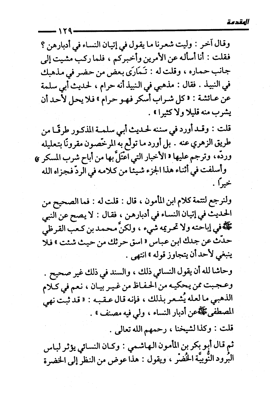 وقال آخر: وليت شعرنا ما يقول في إتيان النساء في أدبارهن؟ فقلت: أنا أسأله عن الأمرين وأخبركم، فلما ركب مشيت إلى جانب حماره، وقلت له: تَمَارَى بعض من حضر في مذهبك في النبيذ. فقال: مذهبي في النبيذ أنه حرام، لحديث أبي سلمة عن عائشة: "كل شراب أسكر فهو حرام" فلا يحل لأحد أن يشرب منه قليلا ولا كثيرا".