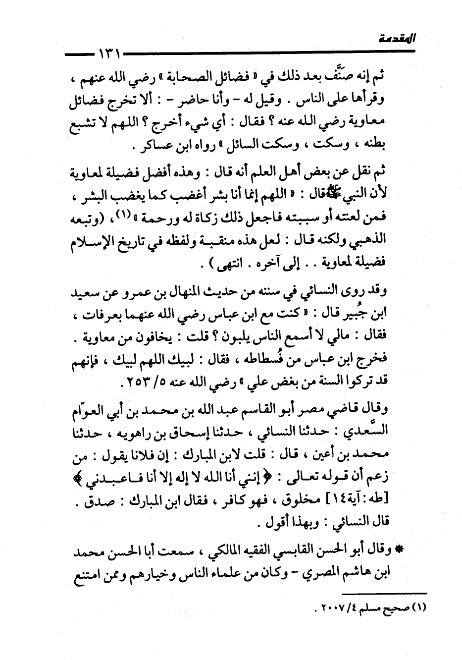 ثم إنه صَنَّف بعد ذلك في "فضائل الصحابة" رضي الله عنهم، وقرأها على الناس. وقيل له -وأنا حاضر-: ألا تخرج فضائل معاوية رضي الله عنه؟ فقال: أي شيء أخرج؟ اللهم لا تشبع بطنه، وسكت، وسكت السائل" رواه ابن عساكر.