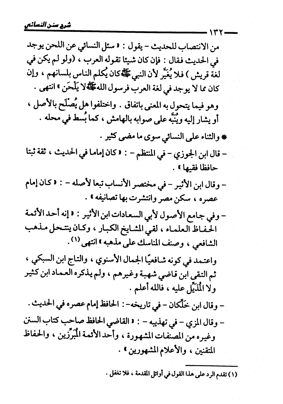 من الانتصاب للحديث- يقول: "سئل النسائي عن اللحن يوجد في الحديث فقال: فإن كان شيئًا تقوله العرب، (ولو لم يكن في لغة قريش) فلا يُغَيَّر لأن النبي - صلى الله عليه وسلم - كان يُكلم الناس بلسانهم، وإن كان مما لا يوجد في لغة العرب فرسول الله - صلى الله عليه وسلم - لا يَلحَن" انتهى.