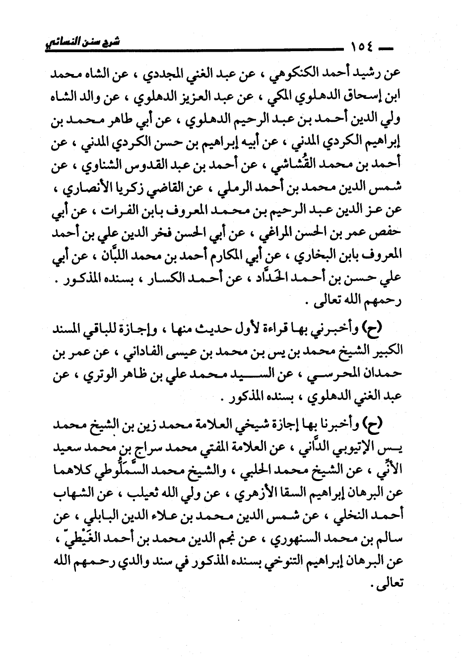 (ح) وأخبرنا بها إجازة شيخي العلامة محمَّد زين بن الشيخ محمَّد يس الإتيوبي الدَّاني، عن العلامة المفتي محمَّد سراج بن محمَّد سعيد الأنِّي، عن الشيخ محمَّد الحلبي، والشيخ محمَّد السَّمَلُّوطي كلاهما عن البرهان إبراهيم السقا الأزهري، عن ولي الله ثعيلب، عن الشهاب أحمد النخلي، عن شمس الدين محمَّد بن علاء الدين البابلي، عن سالم بن محمَّد السنهوري، عن نجم الدين محمَّد بن أحمد الغَيْطيّ، عن البرهان إبراهيم التنوخي بسنده المذكور في سند والدي رحمهم الله تعالى.