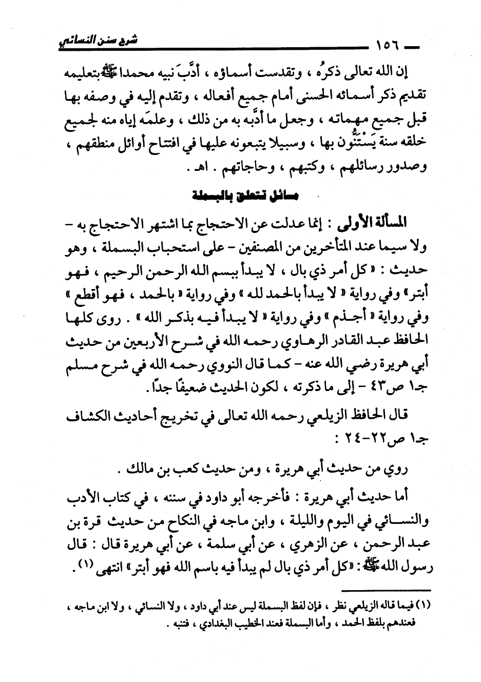 المسألة الأولى: إنما عدلت عن الاحتجاج بما اشتهر الاحتجاج به -ولا سيما عند المتأخرين من المصنفين- على استحباب البسملة، وهو حديث: "كل أمر ذي بال، لا يبدأ ببسم الله الرحمن الرحيم، فهو أبتر" وفي رواية "لا يبدأ بالحمد لله" وفي رواية "بالحمد، فهو أقطع" وفي رواية "أجذم" وفي رواية "لا يبدأ فيه بذكر الله". روى كلها الحافظ عبد القادر الرهاوي رحمه الله في شرح الأربعين من حديث أبي هريرة رضي الله عنه -كما قال النووي رحمه الله في شرح مسلم جـ 1 ص 43 - إلى ما ذكرته، لكون الحديث ضعيفًا جدًا.