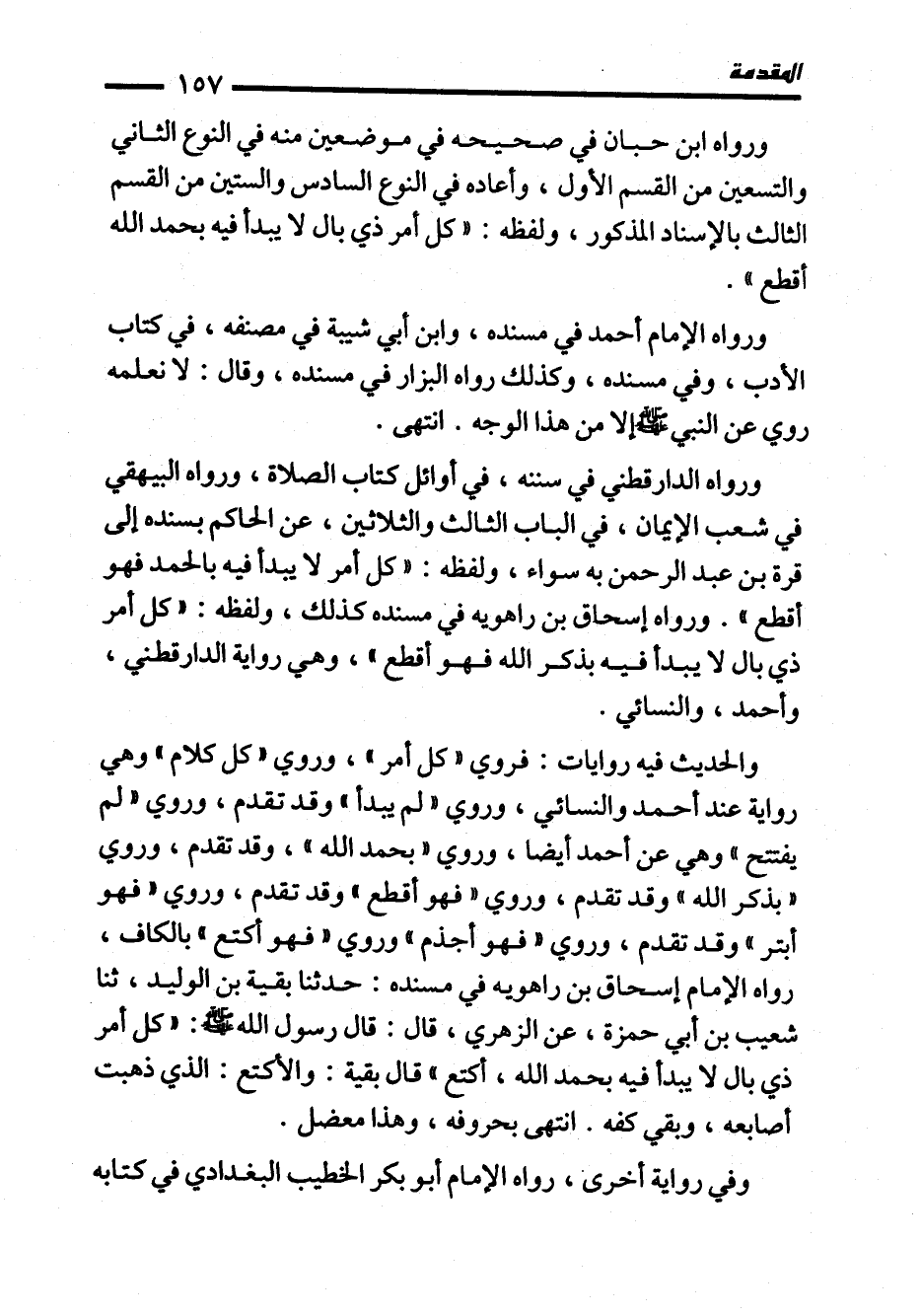 ورواه الدارقطني في سننه، في أوائل كتاب الصلاة، ورواه البيهقي في شعب الإيمان، في الباب الثالث والثلاثين، عن الحاكم بسنده إلى قرة بن عبد الرحمن به سواء، ولفظه: "كل أمر لا يبدأ فيه بالحمد فهو أقطع". ورواه إسحاق بن راهويه في مسنده كذلك، ولفظه: "كل أمر ذي بال لا يبدأ فيه بذكر الله فهو أقطع"، وهي رواية الدارقطني، وأحمد، والنسائي.
