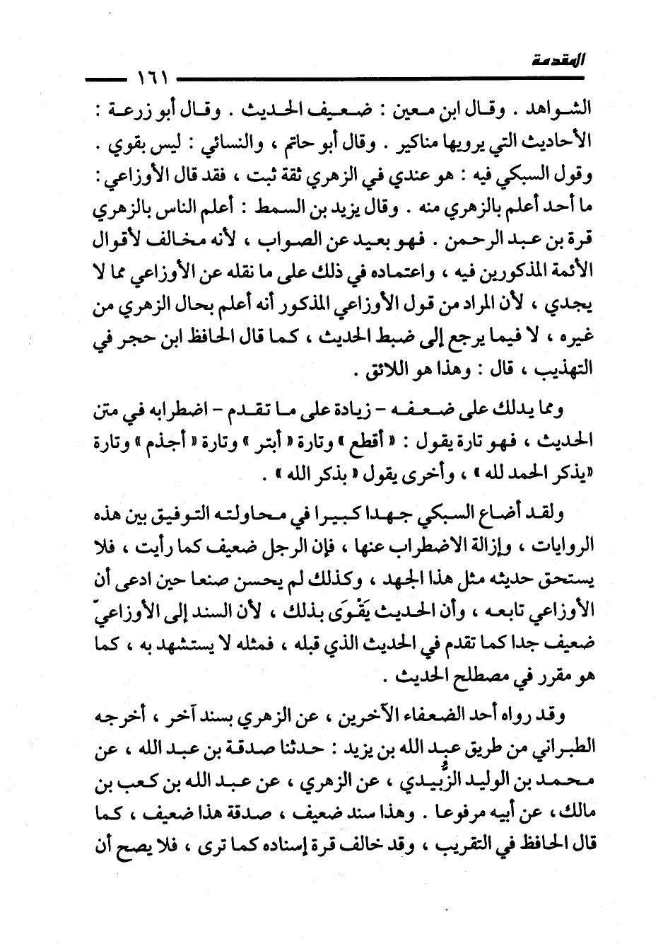 الشواهد. وقال ابن معين: ضعيف الحديث. وقال أبو زرعة: الأحاديث التي يرويها مناكير. وقال أبو حاتم، والنسائي: ليس بقوي. وقول السبكي فيه: هو عندي في الزهري ثقة ثبت، فقد قال الأوزاعي: ما أحد أعلم بالزهري منه. وقال يزيد بن السمط: أعلم الناس بالزهري قرة بن عبد الرحمن. فهو بعيد عن الصواب؛ لأنه مخالف لأقوال الأئمة المذكورين فيه، واعتماده في ذلك على ما نقله عن الأوزاعي مما لا يجدي؛ لأن المراد من قول الأوزاعي المذكور أنه أعلم بحال الزهري من غيره، لا فيما يرجع إلى ضبط الحديث، كما قال الحافظ ابن حجر في التهذيب، قال: وهذا هو اللائق.
