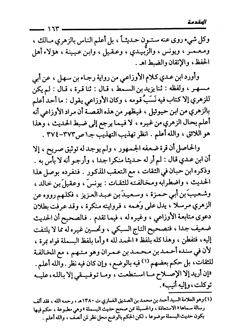 وذكره ابن حبان في الثقات، مع التعقب المذكور. فتفرده بوصل هذا الحديث، واضطرابه ومخالفته للثقات: يونسَ، وعقيلَ بن خالد، وشعيبَ بن أبي حمزة، وسعيدَ بن عبد العزيز، فكلهم رووه عن الزهري مرسلا، يدل على وَهمه، فروايته منكرة، وقد عرفت بطلان دعوى متابعة الأوزاعي، وغيره له، فيما تقدم. فالصحيح أن الحديث ضعيف جدا، فتصحيح التاج السبكي، وتحسين غيره له مما لا يلتفت إليه، فتفطن، وهذا كله بلفظ "الحمد لله" وأما بلفظ البسملة فواه بمرة، لأن في سنده أحمد بن محمَّد بن عمران وهو متهم، مع المخالفة للثقات، بل حكم بعضهم (¬1) فيه بالوضع، وإن كان فيه نظر. والله أعلم. "إن أريد إلا الإصلاح ما استطعت، وما توفيقي إلا بالله، عليه توكلت، وإليه أنيب".